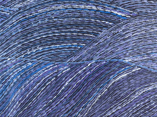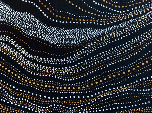 Her recent works predominately focuses on the dreaming of her grandfather’s Country (Atneltyeye) by creating intricate dot works like an aerial view of the land showing sandhills, waterholes and ceremonial sites.