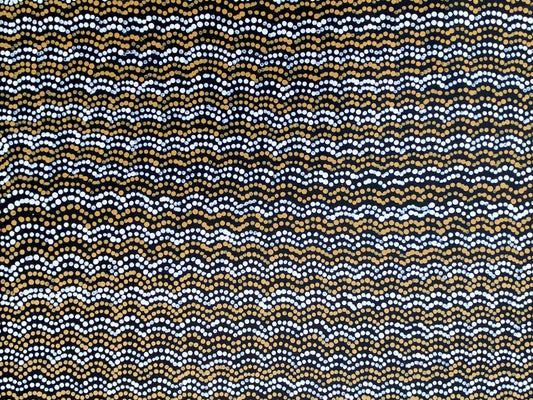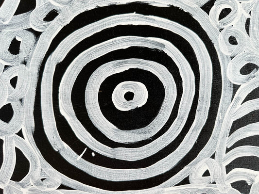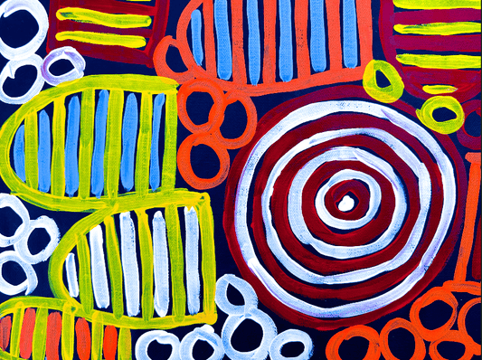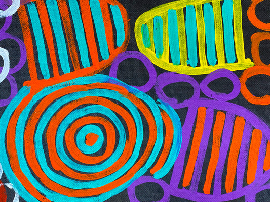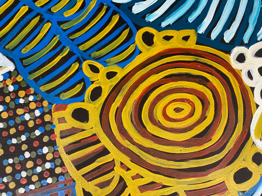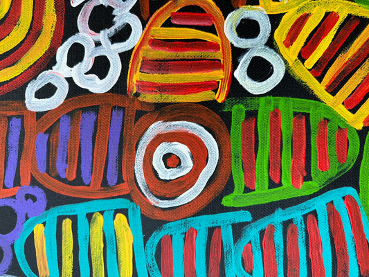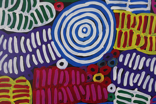 In addition to Awelye, Betty also depicted Bush Plum seeds using intricate fine dots and layers of vivid colours. She also worked on Bush Melon Seed paintings, known for their larger, precise dots.