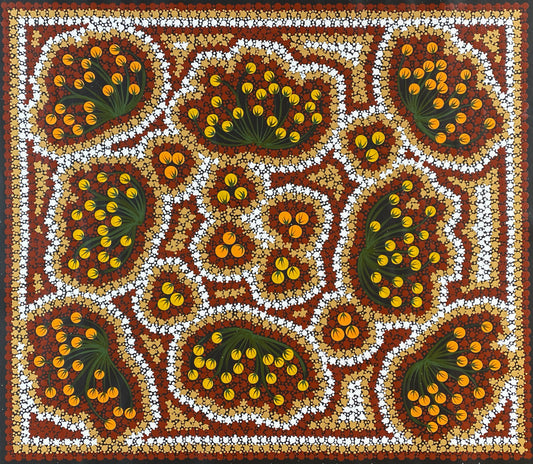 This particular painting is of the bush raisin, which is a bush tomato that, traditionally, has been left to dry on the bush and then harvested. Bush raisins are arguably one of the most important sources of food to the people of central and western desert regions of Australia. The raisin is high in minerals such as iron, potassium, zinc and selenium and able to be stored for several years which is important in the harsh conditions of outback Australia.