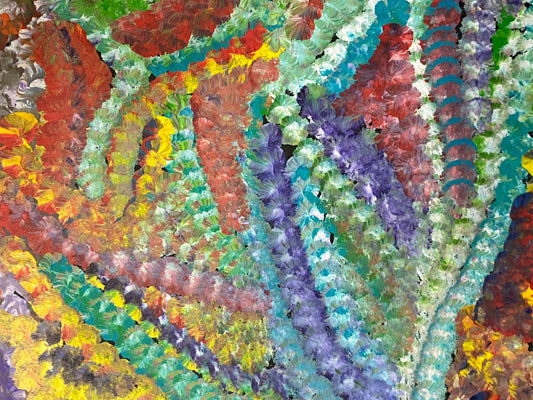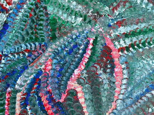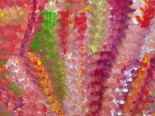 This painting is the dreaming of the Yam Flower and the changing colours during the seasons. The Yam is widely celebrated, as it was an important food source for the people of this area.