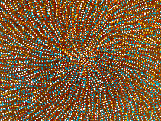 Aboriginal peoples have long used dots in their art and ceremonies, with dot patterns appearing in ancient rock galleries, body painting, and sand designs. Initially, dots may have been used to create a ‘shimmer’ effect, symbolizing energy or aura around designs, often linked to sacred rituals. This technique evolved into the distinctive dot painting style we recognize today, which emerged in the 1970s from the Papunya Tula artists of Central Australia. The style has since become a hallmark of Aboriginal art, especially in the Central and Western Desert regions.