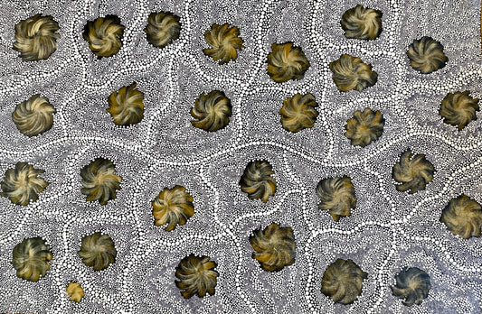 Aboriginal peoples have long used dots in their art and ceremonies, with dot patterns appearing in ancient rock galleries, body painting, and sand designs. Initially, dots may have been used to create a ‘shimmer’ effect, symbolizing energy or aura around designs, often linked to sacred rituals. This technique evolved into the distinctive dot painting style we recognize today, which emerged in the 1970s from the Papunya Tula artists of Central Australia. The style has since become a hallmark of Aboriginal art, especially in the Central and Western Desert regions.