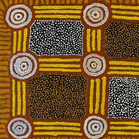 She paints the stories passed down her of Tjukurpa and Tingarri (Dreamtime stories / creation stories) and the traditional designs associated.