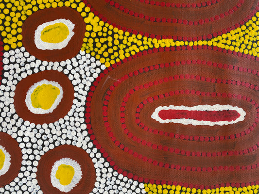 Faith, until recently, lived her entire life in the bush. Her late husband Ivan Butler was on dialysis in Alice Springs and during this time in Alice Springs she painted. Since her husband’s passing, she now resides permanently out bush with her children and grandchildren and other extended family members.
