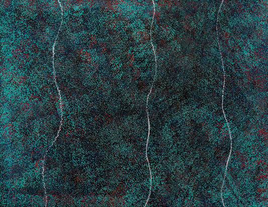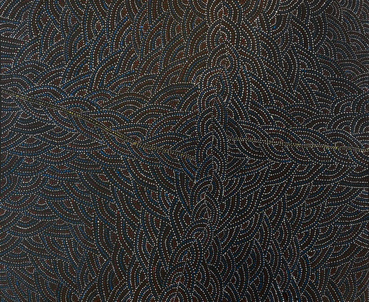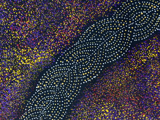 Gracie has a unique style of delicate dotting and colour variations used in an aerial perspective to portray the seasonal changes from flower to fruit of the Bush Plum known to the Alyawarre people as Arnwekety. It is a plant of great significance to the women of Gracie’s traditional country (Eastern Desert).