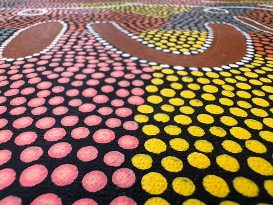 Isobel is the granddaughter of Gwoja Tjungarrayi, a respected elder and lawman of the Walpiri-Anmatyerre people. She belongs to a lineage of artists prominent in the western desert art movement. Her uncle, Clifford Possum Tjapaltjarri (dec), was a highly acclaimed artist, and her family includes other accomplished painters such as Gabrielle Possum Nungarrayi and Michelle Possum Nungarrayi, along with uncles Tim Leura Tjapaltjarri and Cassidy Tjapaltjarri (both dec).