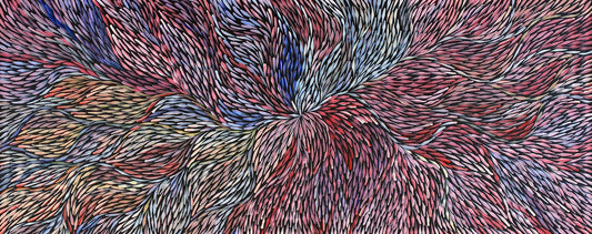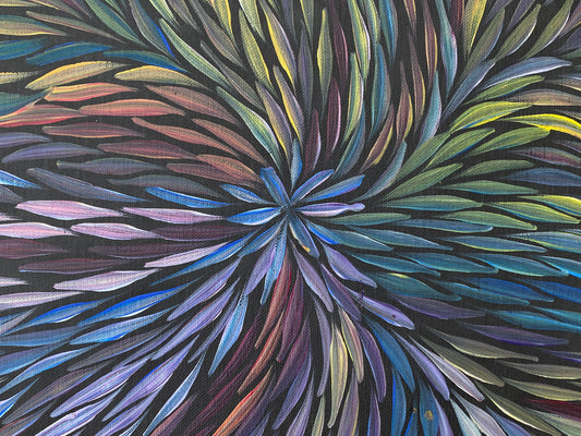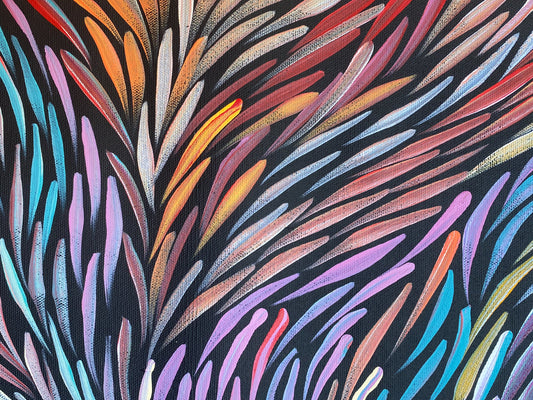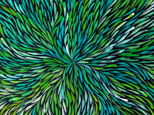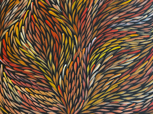 She is well known for her great sense of movement and colour depicting the leaves and seeds changing colours throughout the seasons. Various leaves and seeds are predominately collected by the women for medicine and food from a variety of trees/shrubs for use all year round. The leaves and seeds were once vital to Jeannie and her ancestors and through her paintings these stories are passed down and celebrated.