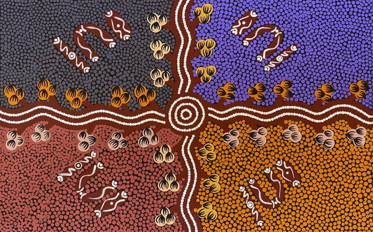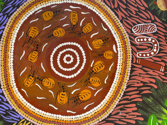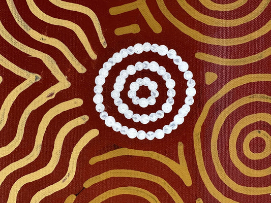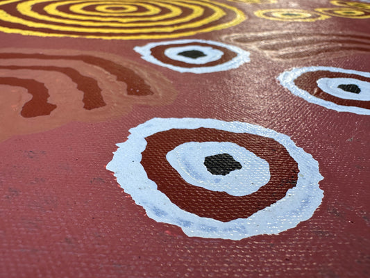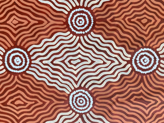Mima Tjuta is the Dream time story. A Dreamtime story is a traditional Aboriginal Australian narrative that explains the creation of the world and its features. It often involves ancestral beings, animals, and natural elements, conveying cultural beliefs, values, and lessons through symbolic storytelling. This painting is an aerial depiction of that story whereby Julie uses traditional iconography to depict her dreaming.