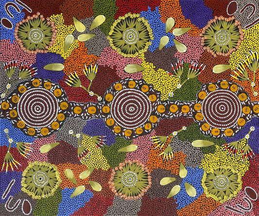 She painted using dot art and iconography and beautiful depictions of the bush tucker that the women collected in her homelands.