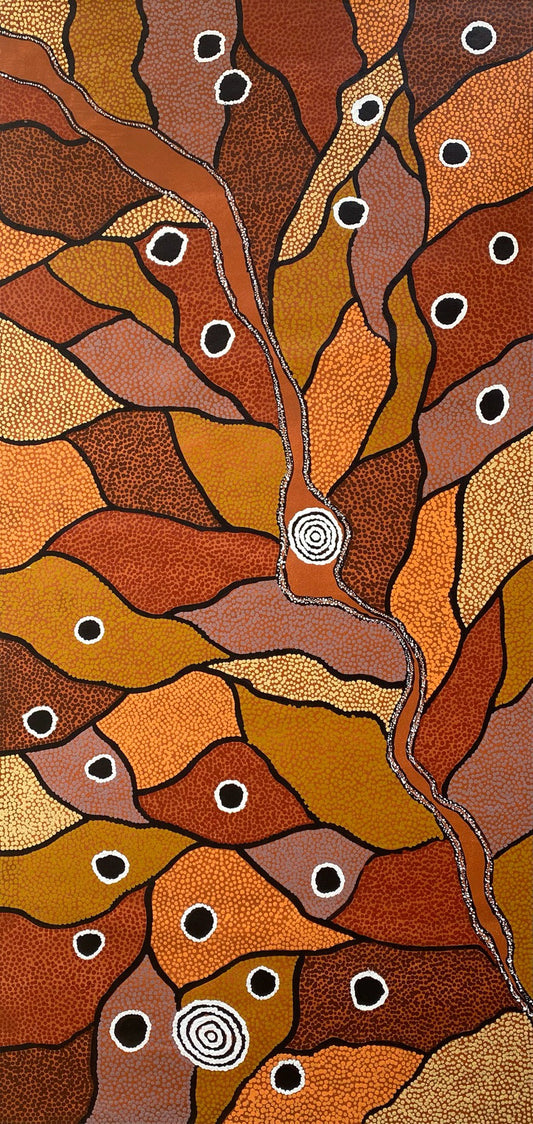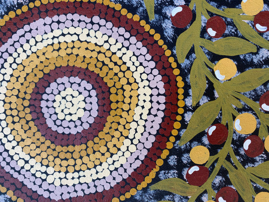 Lindy paints various dreaming's related to bush tucker women collect and stories related to her country such as this painting. This painting is an aerial depiction of her country showing the topography of her ancestral land. Many stories are not privy to those who are not initiated and this is one of them. The title Lindy Lou has given this painting is not one we are familiar with nor was the information provided for this story related to her country.