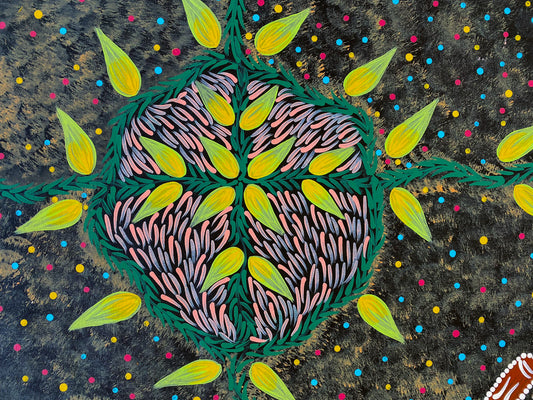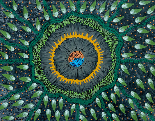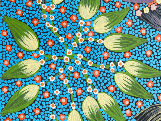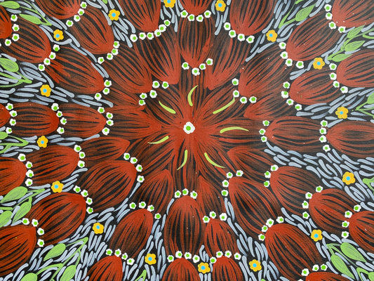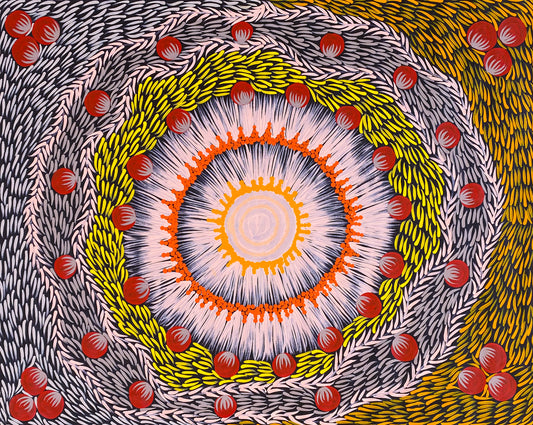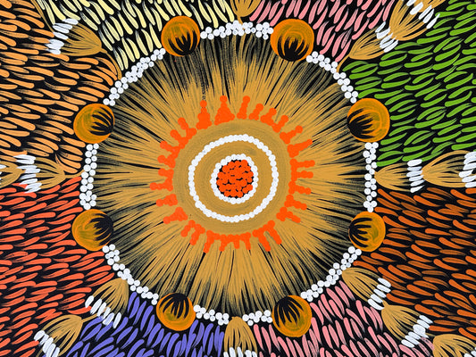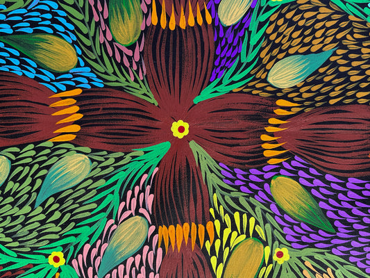 Her art tells the stories related to her Country and beautiful depictions of the bush tucker collected by the women of her community.