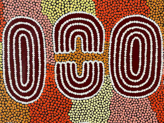 Her style is unique. Mary has mastered a blend of traditional and contemporary and beautifully incorporating iconography to depict her dreamings.