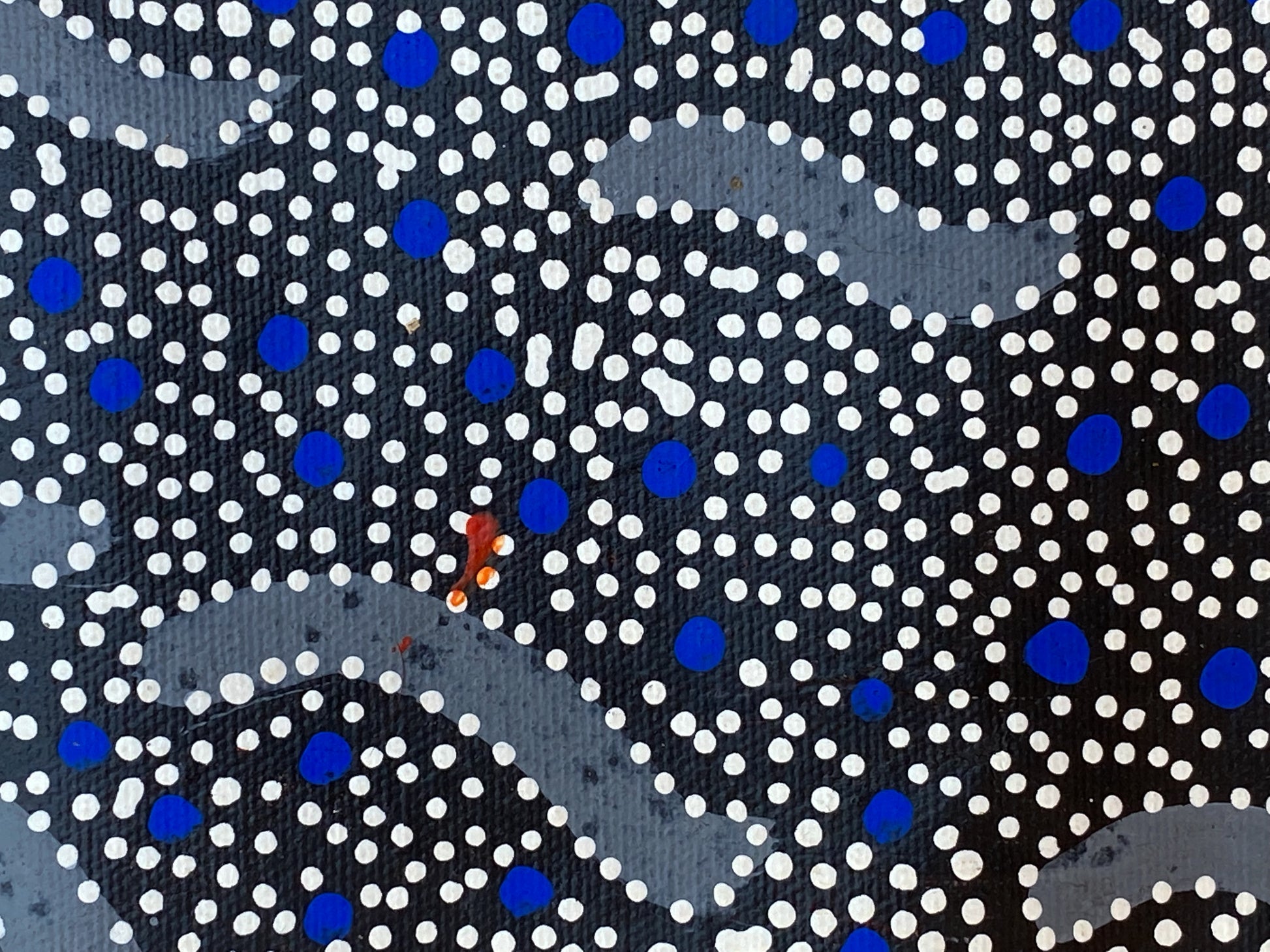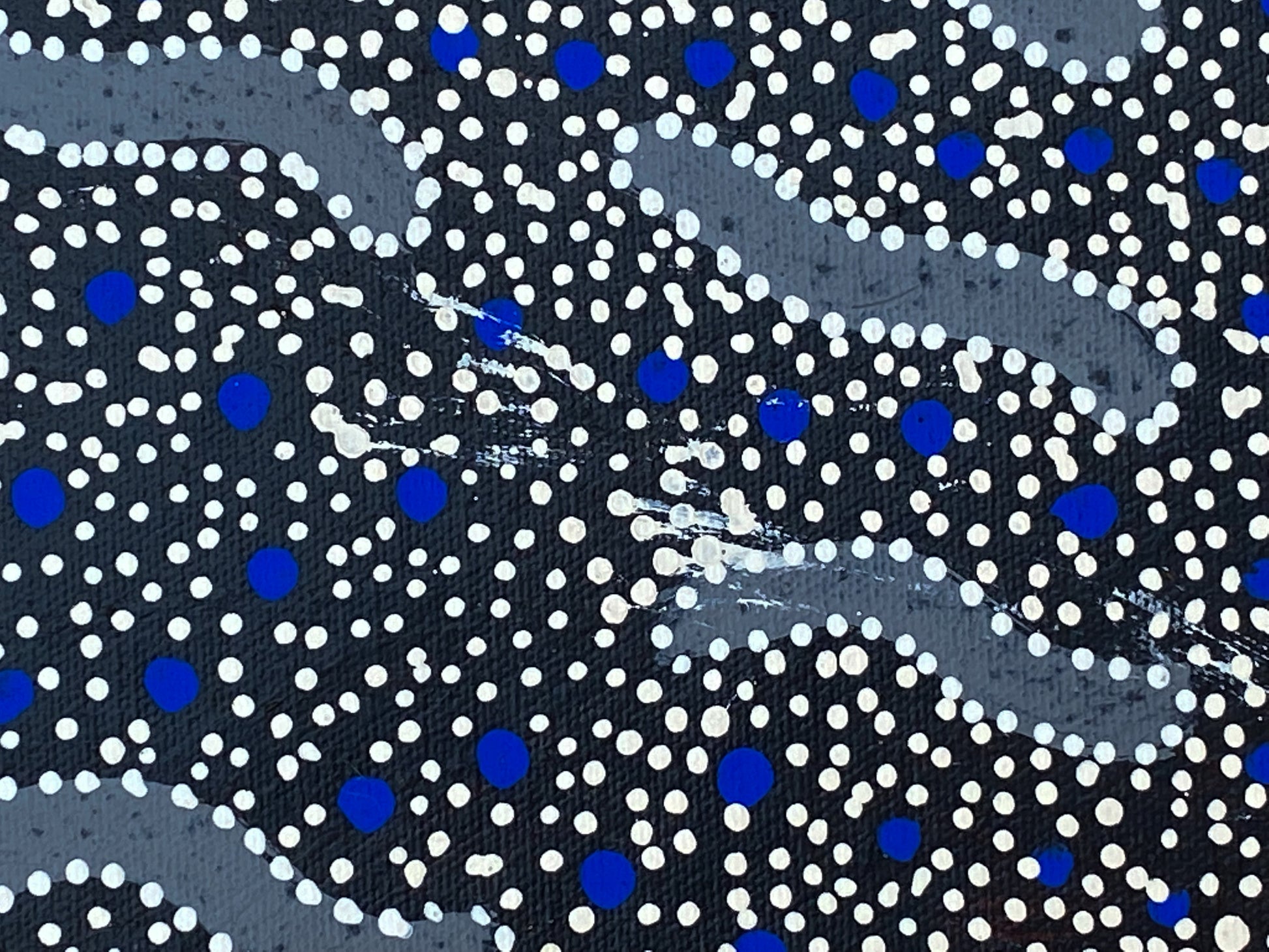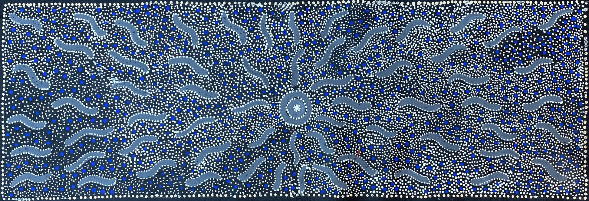 Eileen started painting in the late 90s depicting the stories around Women’s Ceremonies including the Body Paint designs painted onto the top half of the women. She also paints the dreaming Arlatyeye, Bush Yam/Bush Potato which was an important food source of her ancestors. The Yam grows underground like the common yam and a vine like shrub above ground. The women traditionally collect the yam and gather the leaves/vine above ground for medicine which was used topically to treat cuts, wounds, and minor skin irritations.
