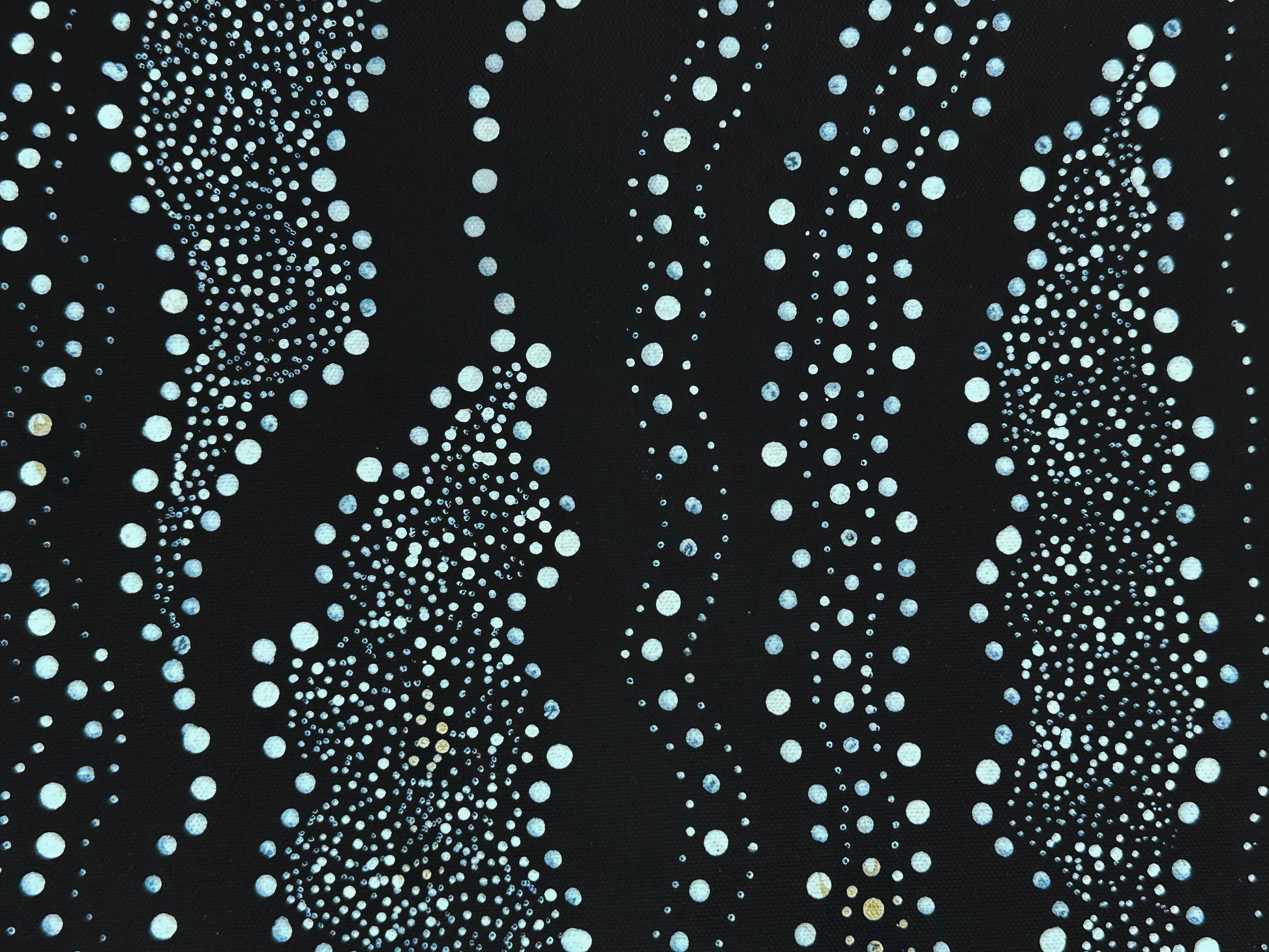 This painting can be hung vertically or horizontally. Anna's painting was not produced in a sterile gallery. There are irregularities that are seen in this artwork as the photos show. She painted her artwork surrounded by family on the ground.