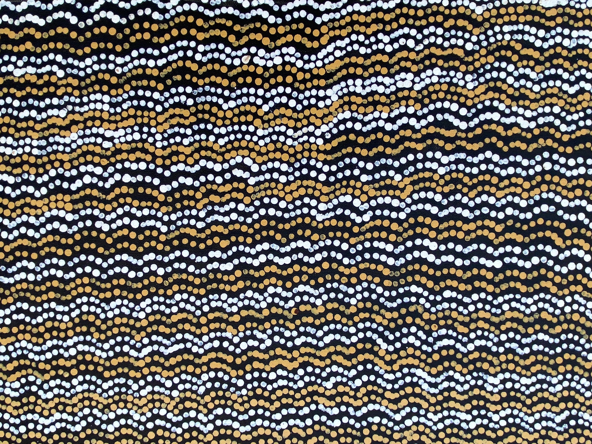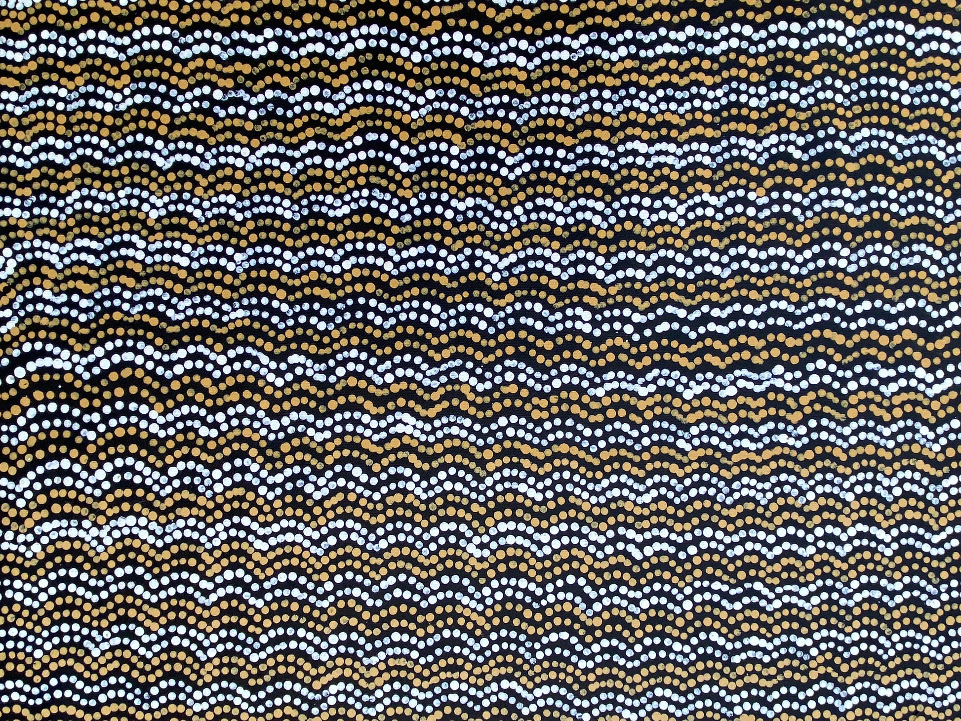 In addition to Awelye, Betty also depicted Bush Plum seeds using intricate fine dots and layers of vivid colours. She also worked on Bush Melon Seed paintings, known for their larger, precise dots.