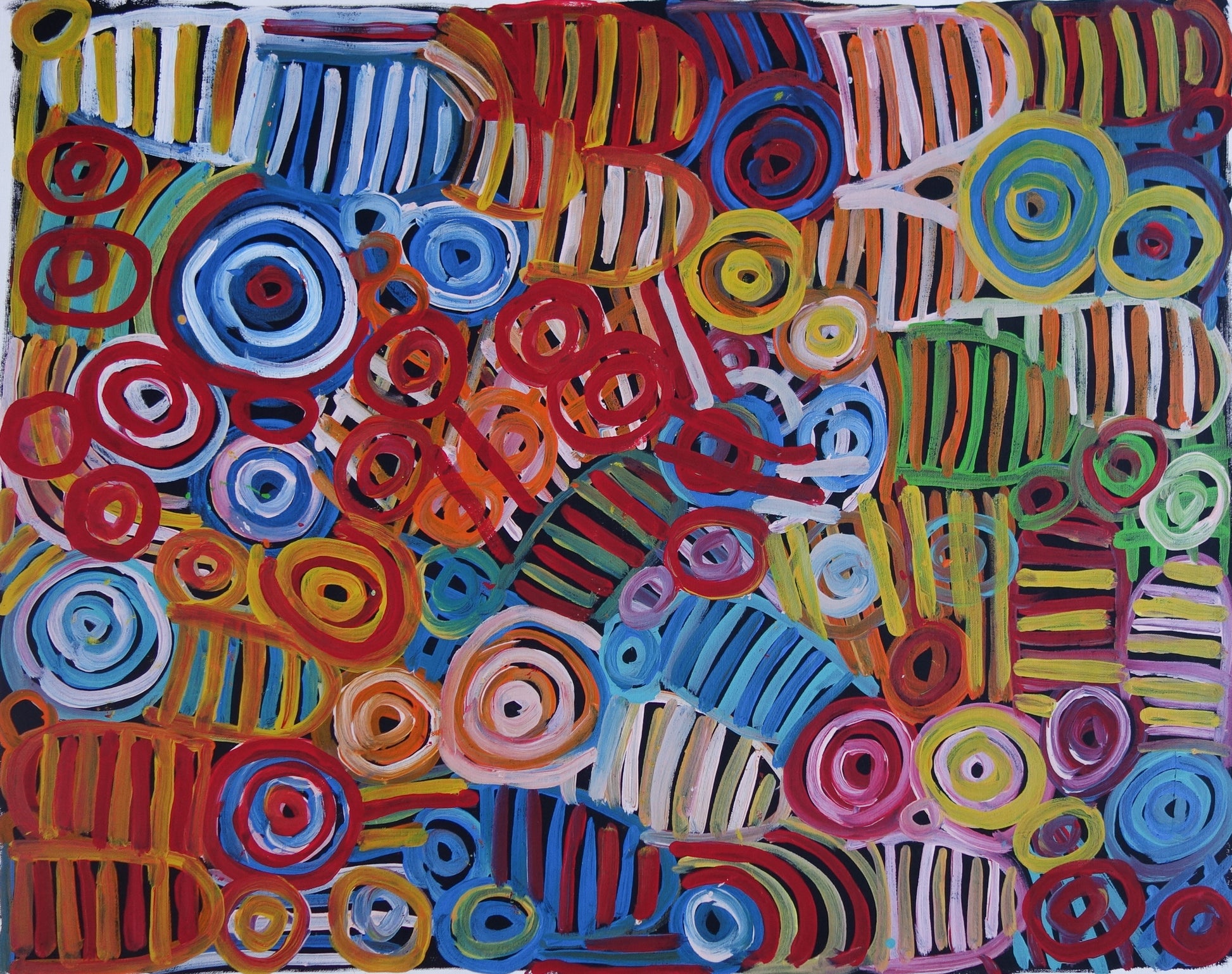 In addition to Awelye, Betty also depicted Bush Plum seeds using intricate fine dots and layers of vivid colours. She also worked on Bush Melon Seed paintings, known for their larger, precise dots.