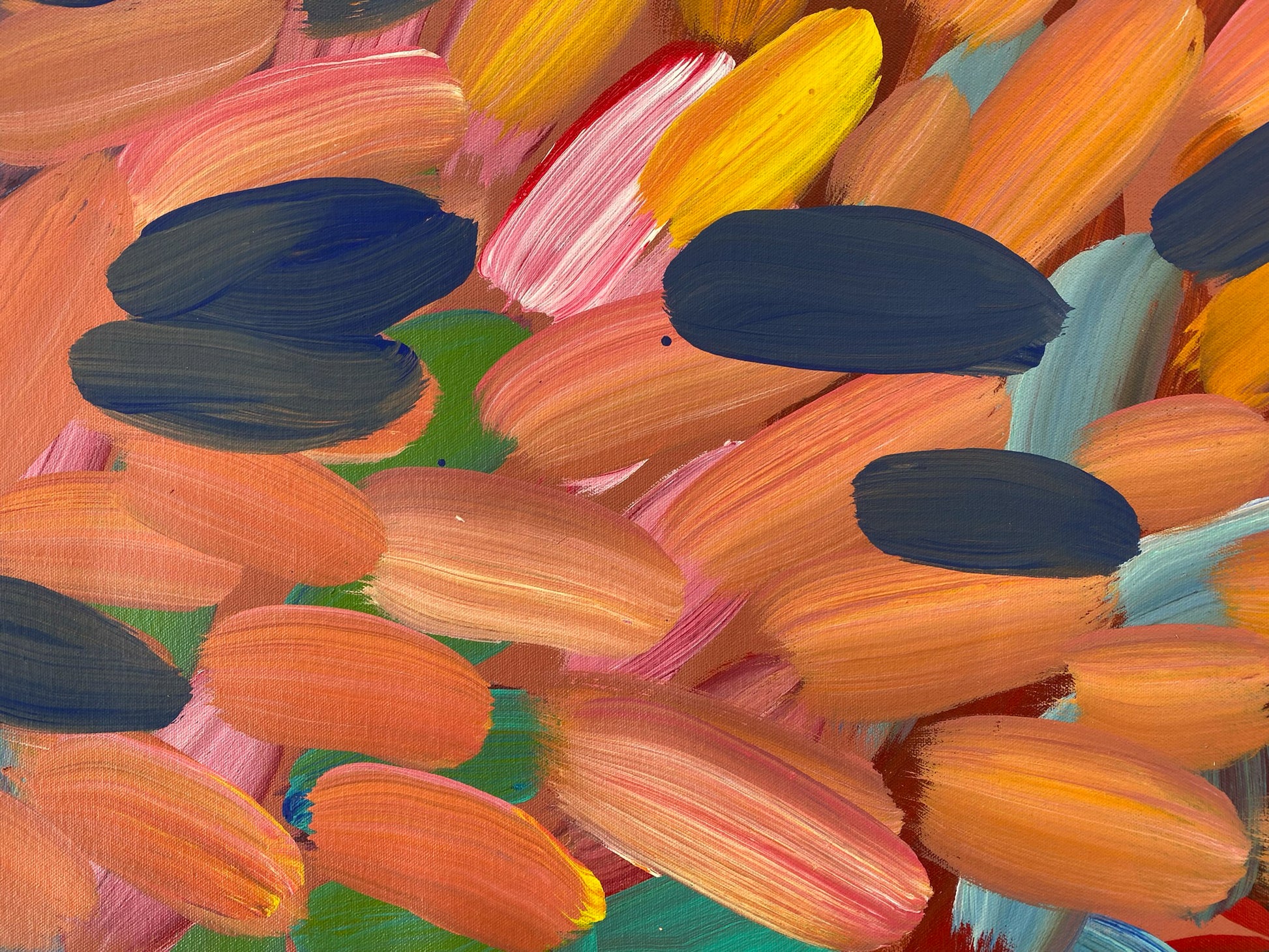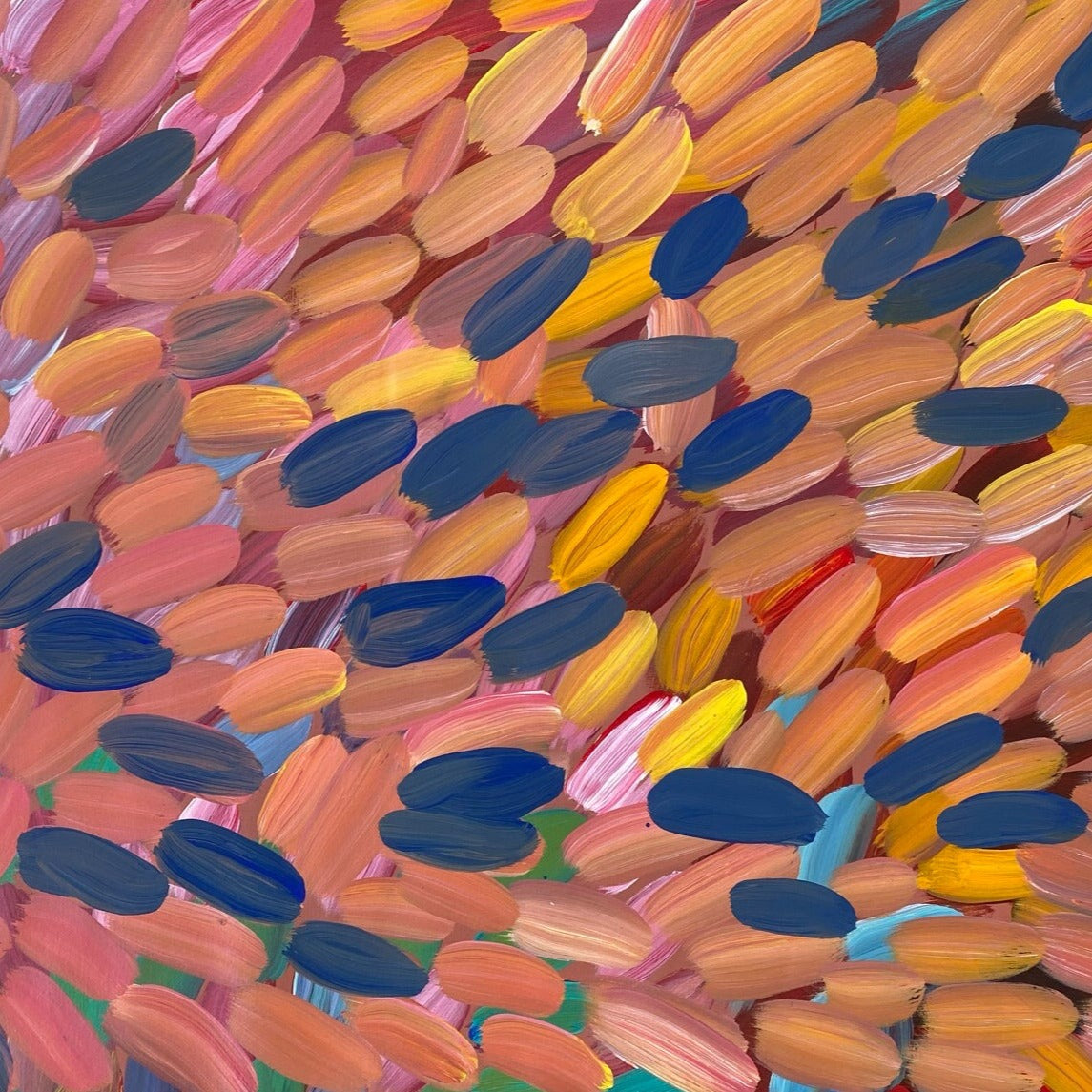 Gloria was one of the founding members of the Batik Movement in the 1970s then moving to acrylic on canvas. Her earlier works were of Awelye designs which are the designs painted across women’s top half of their bodies during ceremony. The iconic Bush Medicine Leaves Dreaming portrays the various stages of growth throughout the year of this important plant which have medicinal properties and has been used for generations by Gloria’s ancestors. Gloria started painting her larger leaves later in her career.