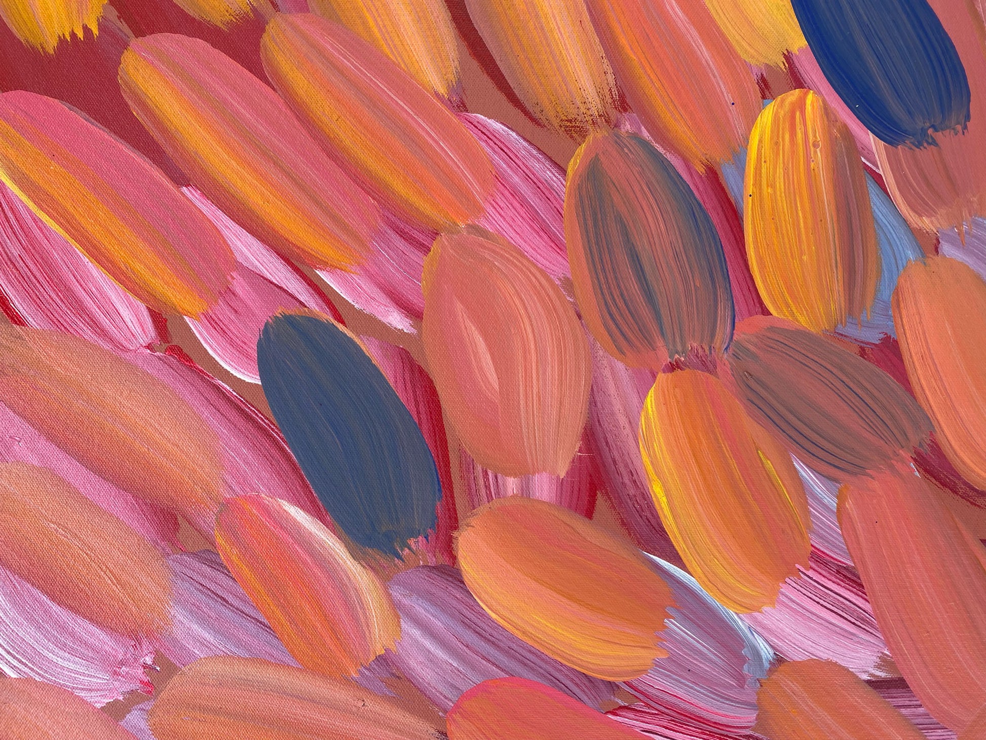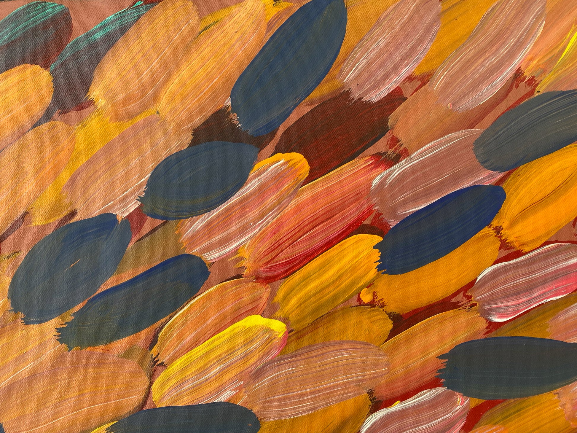 Dreaming’s: Leaves, Bush Medicine leaves, Grass seeds, Pencil Yam, Awelye (women’s ceremony and body paint designs), Arnkerrthe (Mountain or Thorny Devil Lizard) and Aknangkere