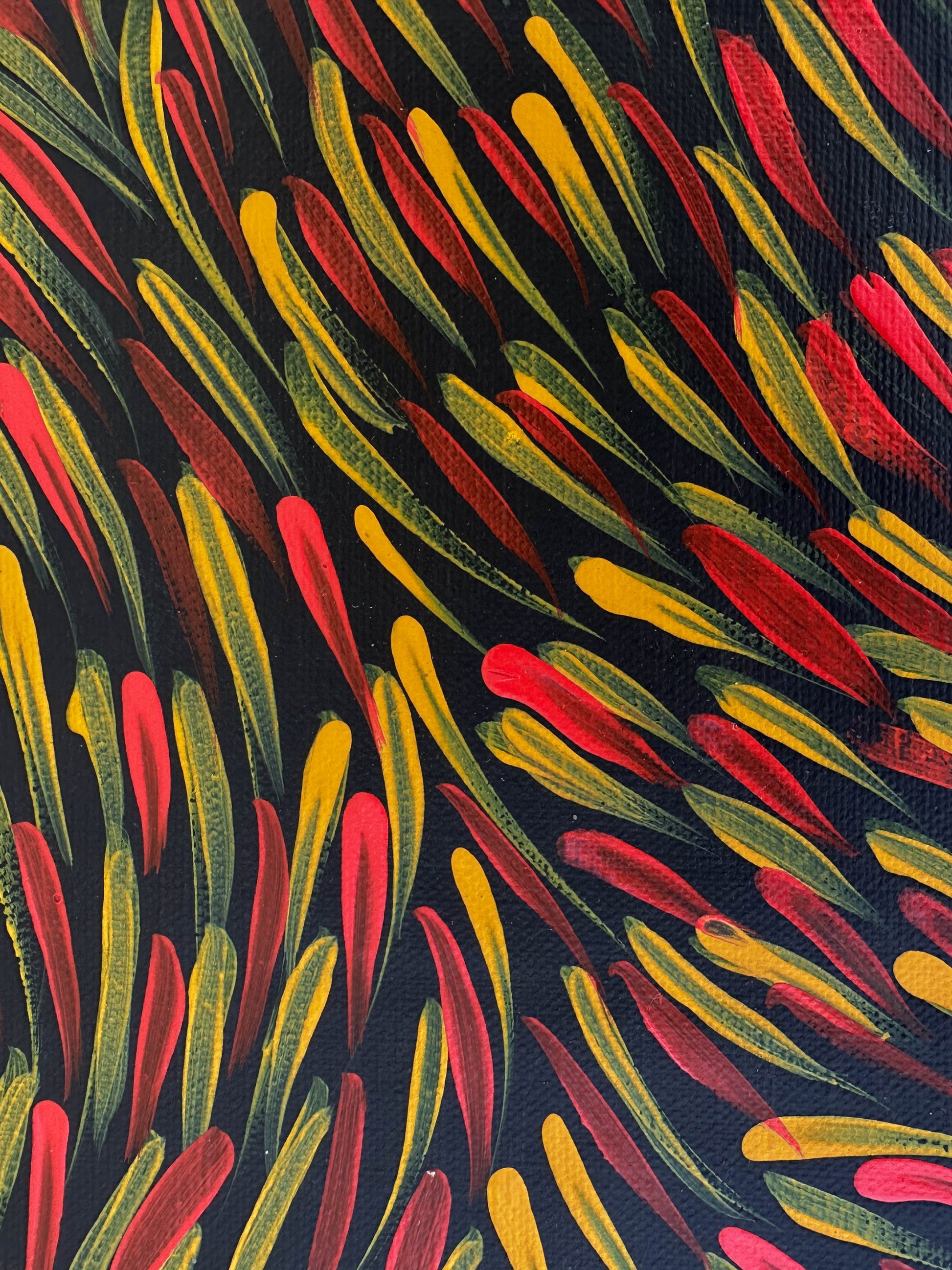 Gloria was one of the founding members of the Batik Movement in the 1970s then moving to acrylic on canvas. Her earlier works were of Awelye designs which are the designs painted across women’s top half of their bodies during ceremony. The iconic Bush Medicine Leaves Dreaming portrays the various stages of growth throughout the year of this important plant which have medicinal properties and has been used for generations by Gloria’s ancestors.