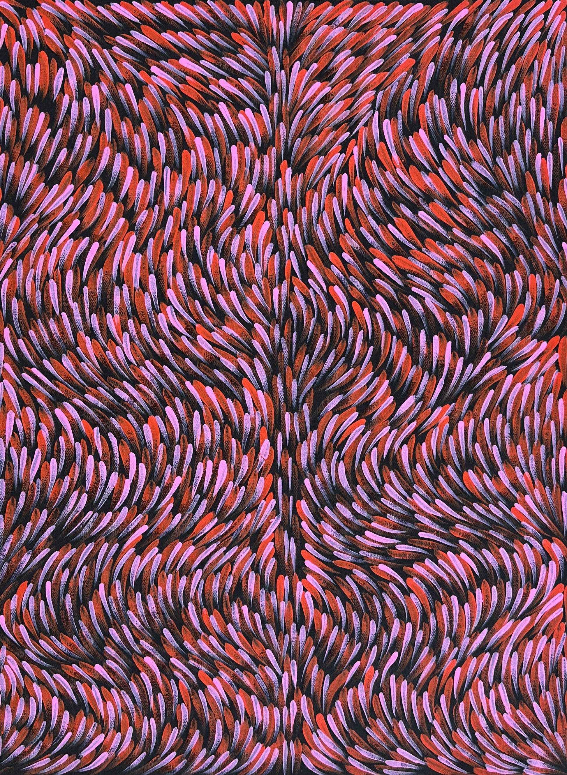 Gloria was one of the founding members of the Batik Movement in the 1970s then moving to acrylic on canvas. Her earlier works were of Awelye designs which are the designs painted across women’s top half of their bodies during ceremony. The iconic Bush Medicine Leaves Dreaming portrays the various stages of growth throughout the year of this important plant which have medicinal properties and has been used for generations by Gloria’s ancestors.
