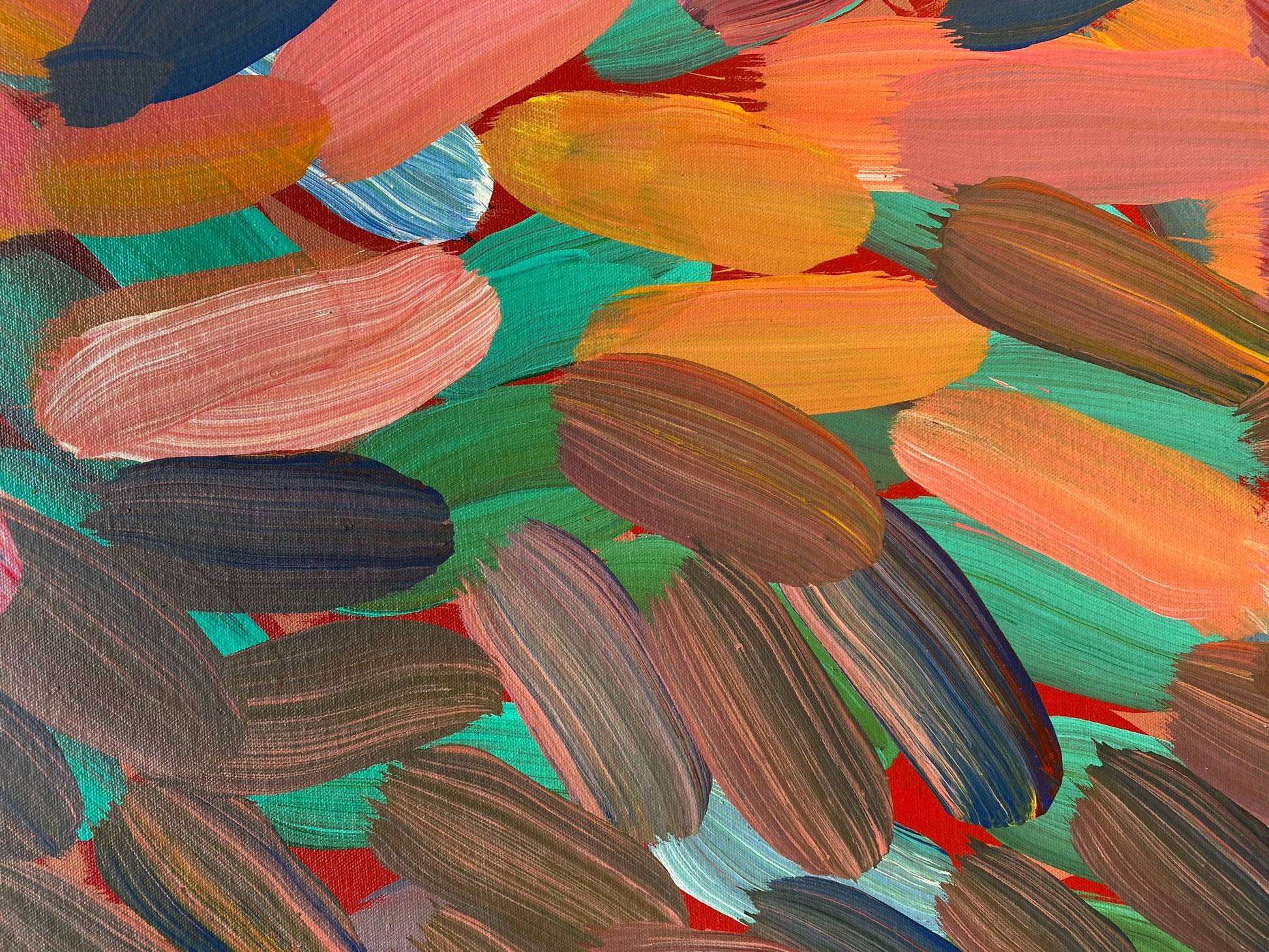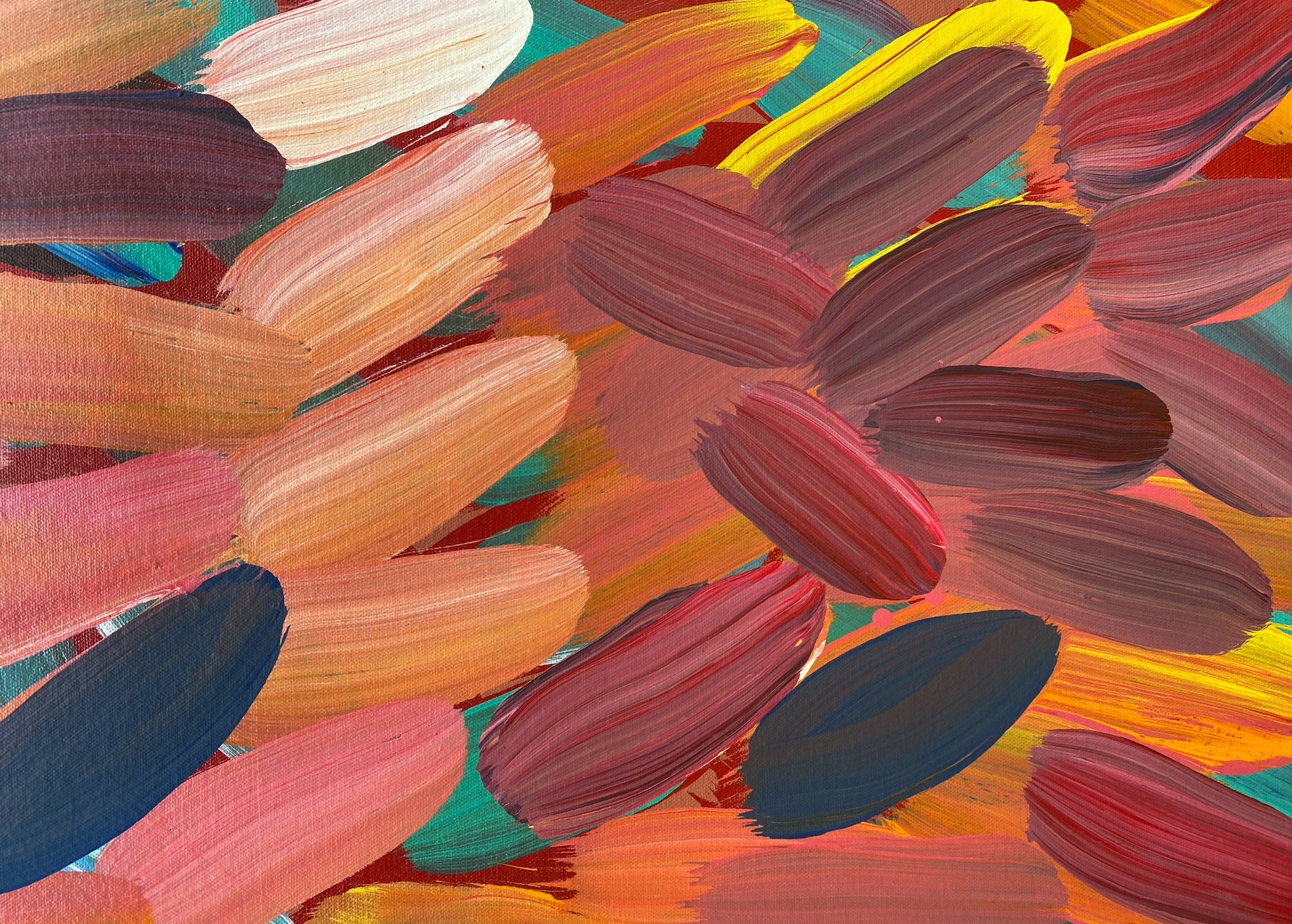 Dreaming’s: Leaves, Bush Medicine leaves, Grass seeds, Pencil Yam, Awelye (women’s ceremony and body paint designs), Arnkerrthe (Mountain or Thorny Devil Lizard) and Aknangkere