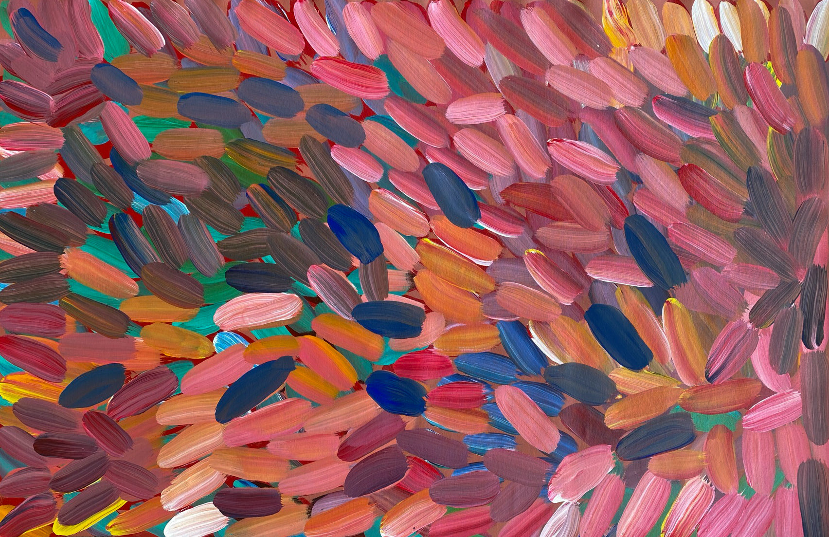 Gloria was one of the founding members of the Batik Movement in the 1970s then moving to acrylic on canvas. Her earlier works were of Awelye designs which are the designs painted across women’s top half of their bodies during ceremony. The iconic Bush Medicine Leaves Dreaming portrays the various stages of growth throughout the year of this important plant which have medicinal properties and has been used for generations by Gloria’s ancestors. Gloria started painting her larger leaves later in her career.