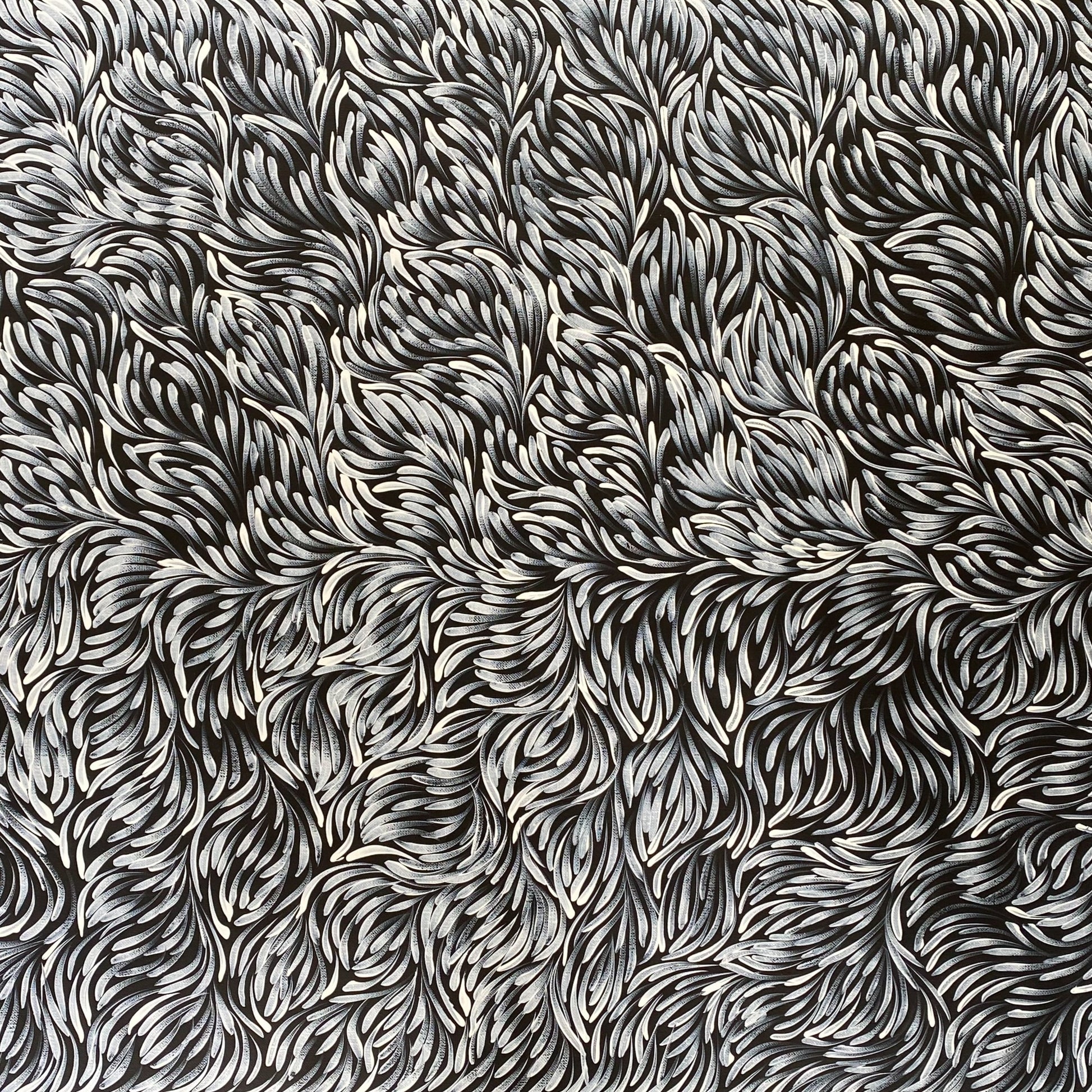 Gloria was one of the founding members of the Batik Movement in the 1970s then moving to acrylic on canvas. Her earlier works were of Awelye designs which are the designs painted across women’s top half of their bodies during ceremony. The iconic Bush Medicine Leaves Dreaming portrays the various stages of growth throughout the year of this important plant which have medicinal properties and has been used for generations by Gloria’s ancestors.