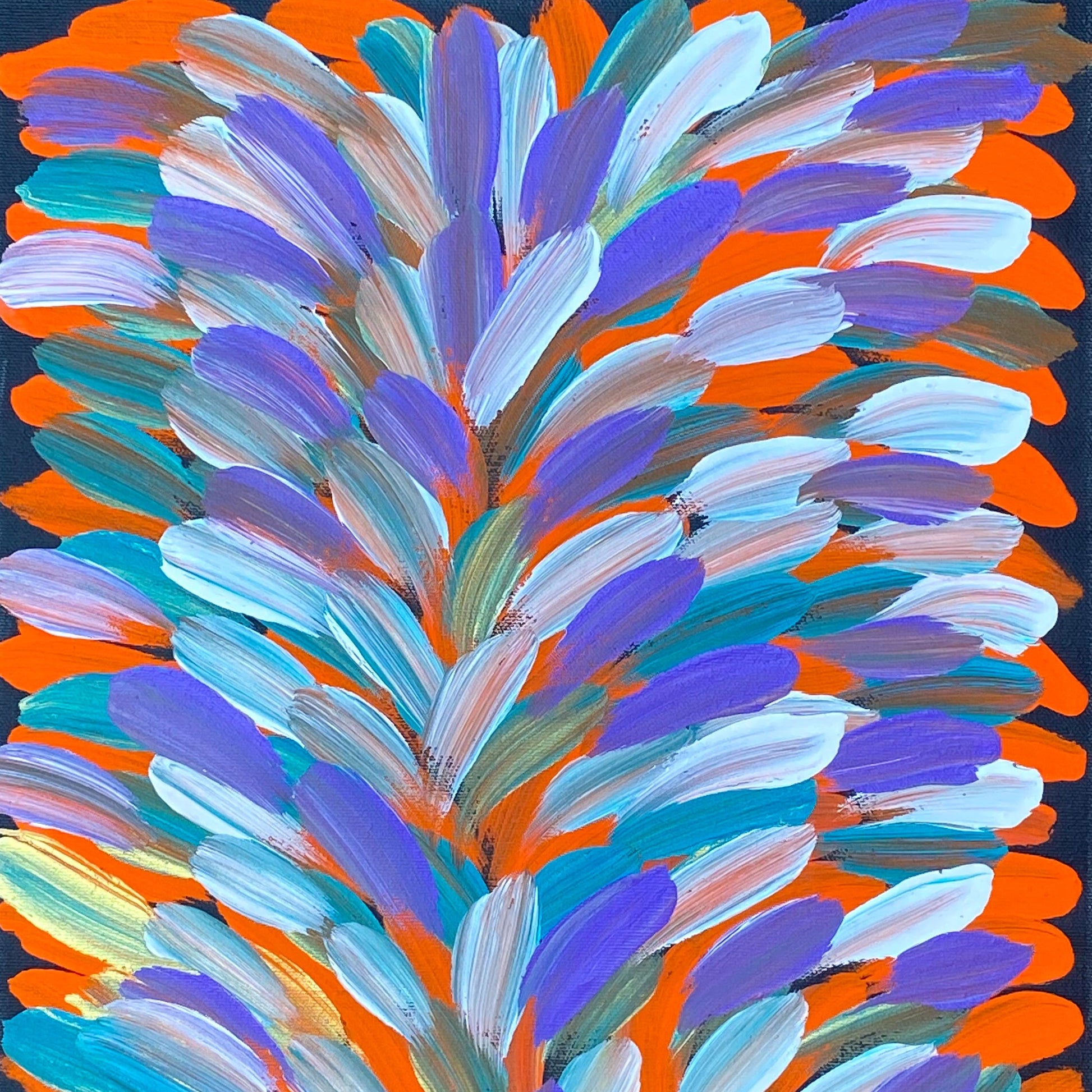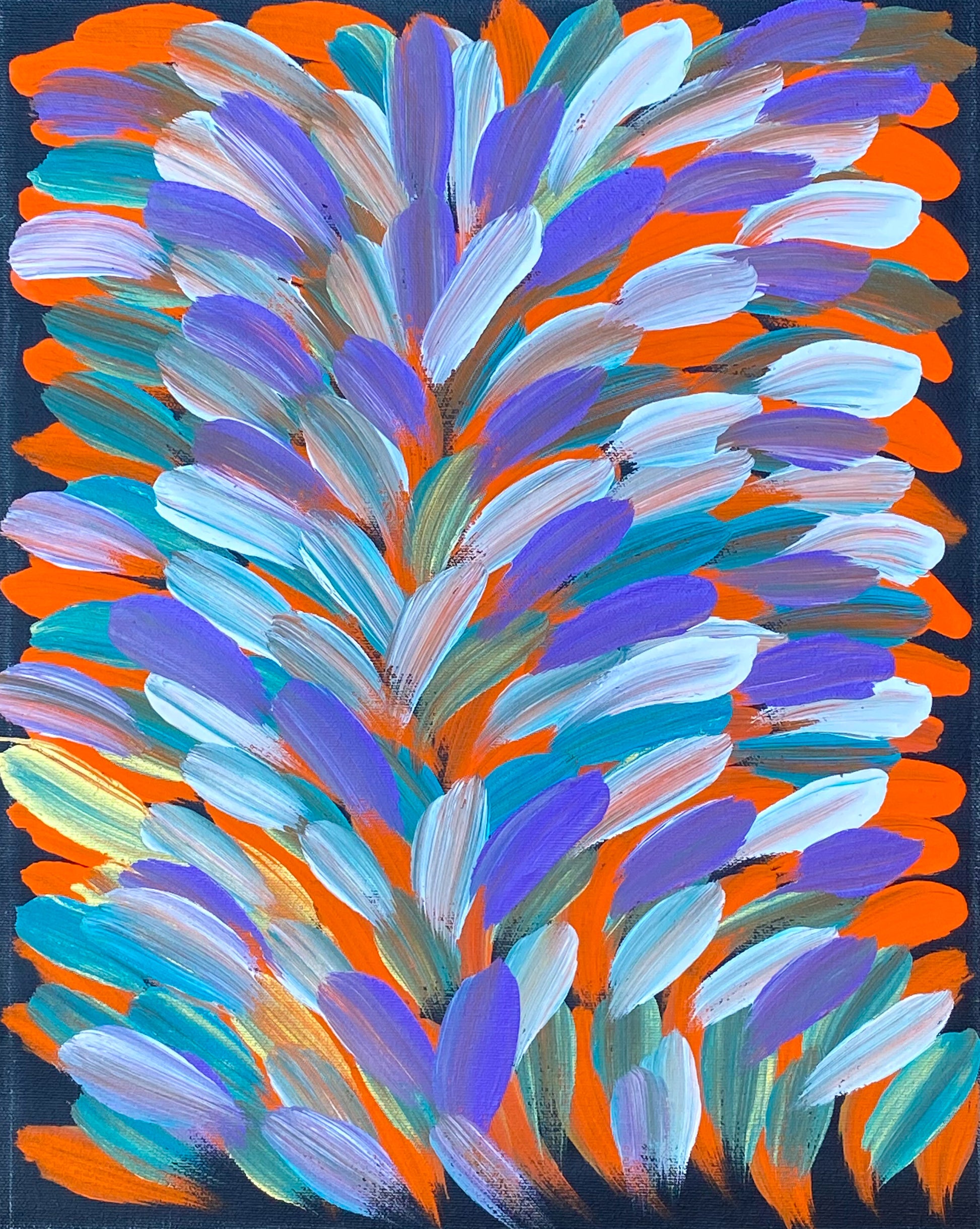 Dreaming’s: Leaves, Bush Medicine leaves, Grass seeds, Pencil Yam, Awelye (women’s ceremony and body paint designs), Arnkerrthe (Mountain or Thorny Devil Lizard) and Aknangkere