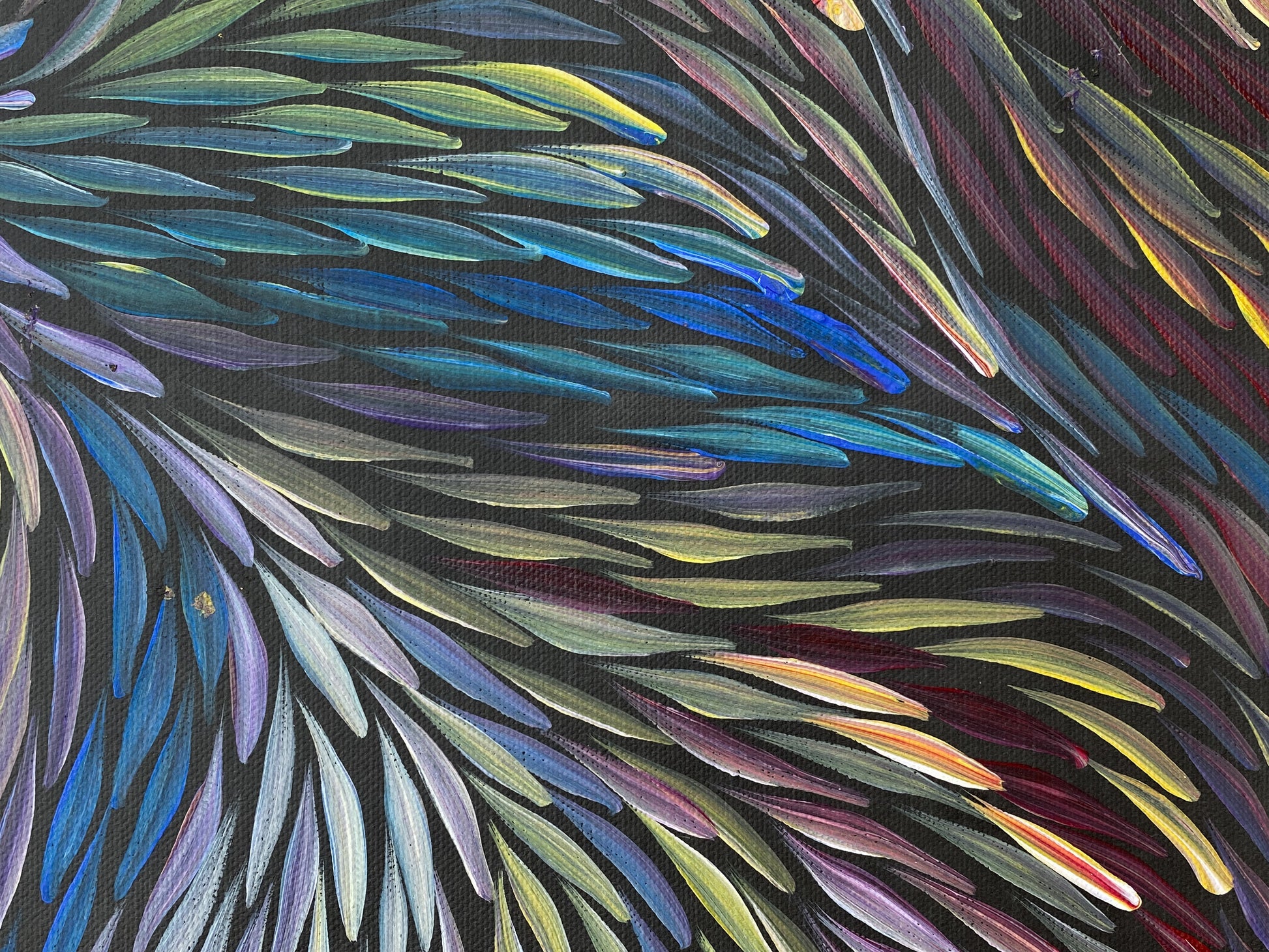 She is well known for her great sense of movement and colour depicting the leaves and seeds changing colours throughout the seasons.  Various leaves and seeds are predominately collected by the women for medicine and food from a variety of trees/shrubs for use all year round. The leaves and seeds were once vital to Jeannie and her ancestors and through her paintings these stories are passed down and celebrated.