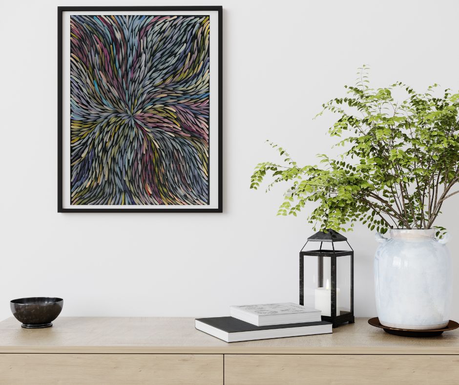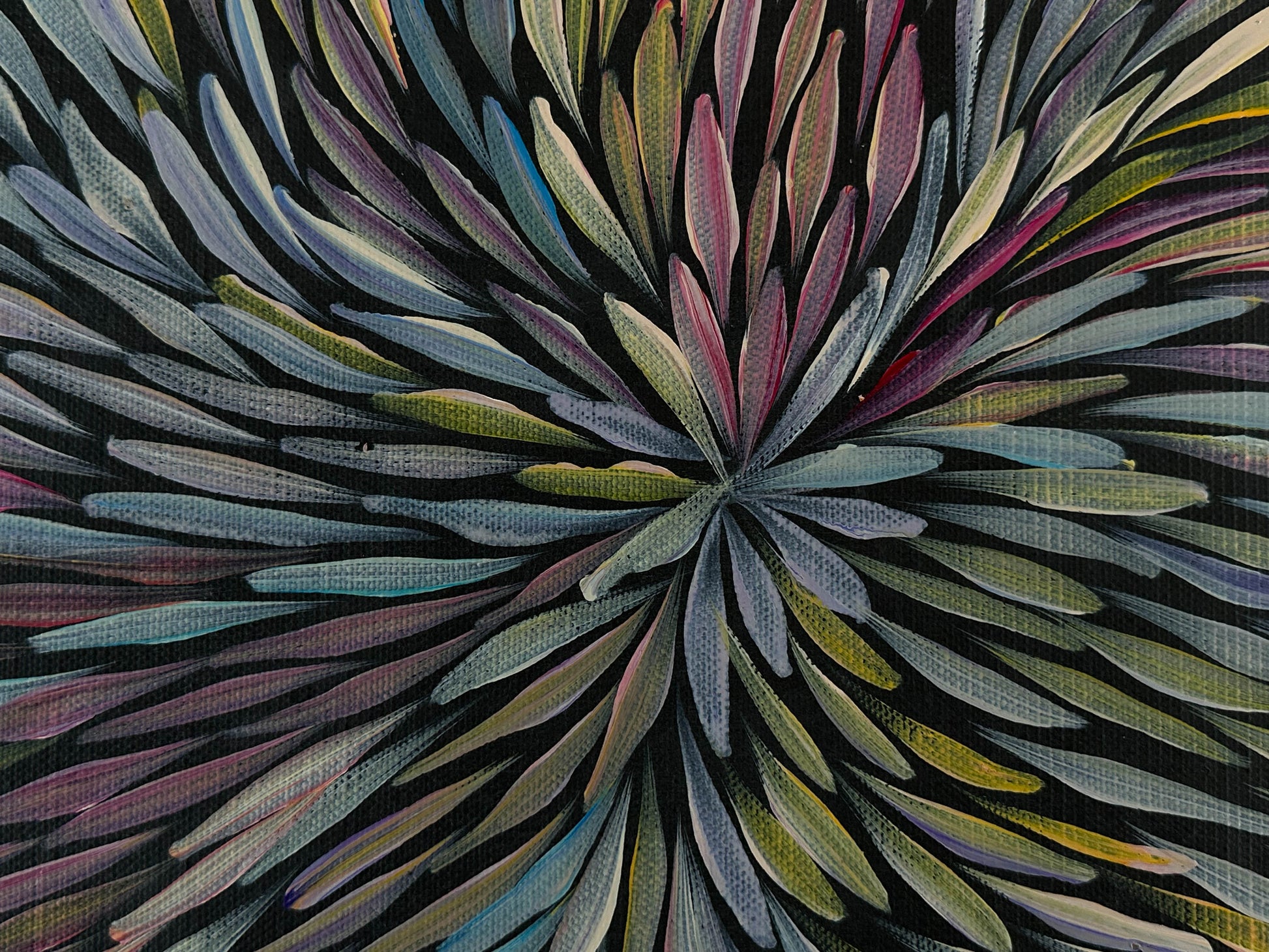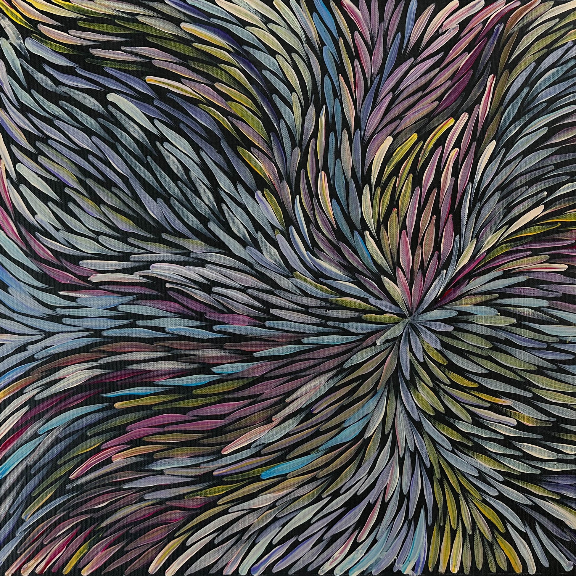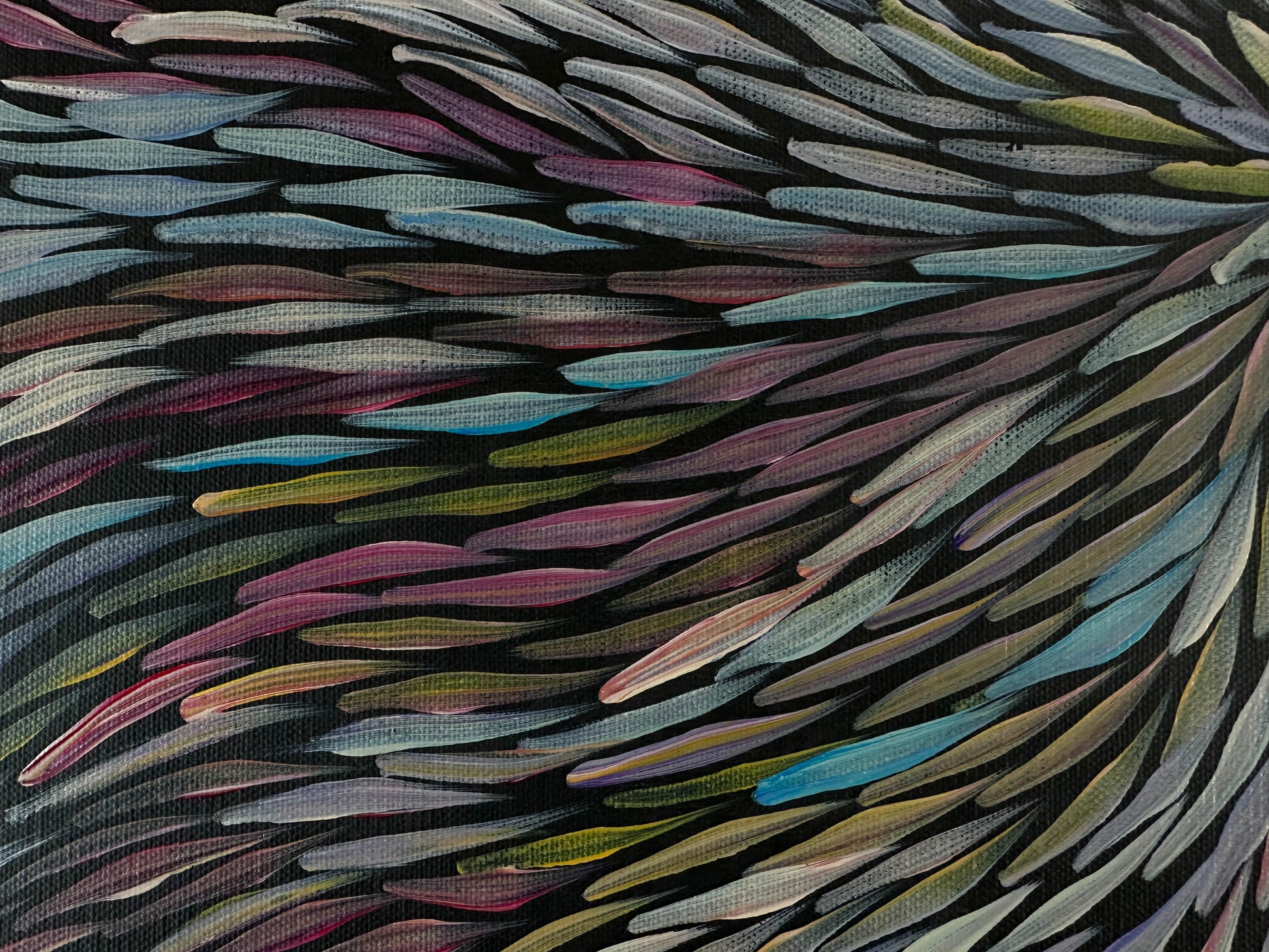 She is well known for her great sense of movement and colour depicting the leaves and seeds changing colours throughout the seasons.  Various leaves and seeds are predominately collected by the women for medicine and food from a variety of trees/shrubs for use all year round. The leaves and seeds were once vital to Jeannie and her ancestors and through her paintings these stories are passed down and celebrated.
