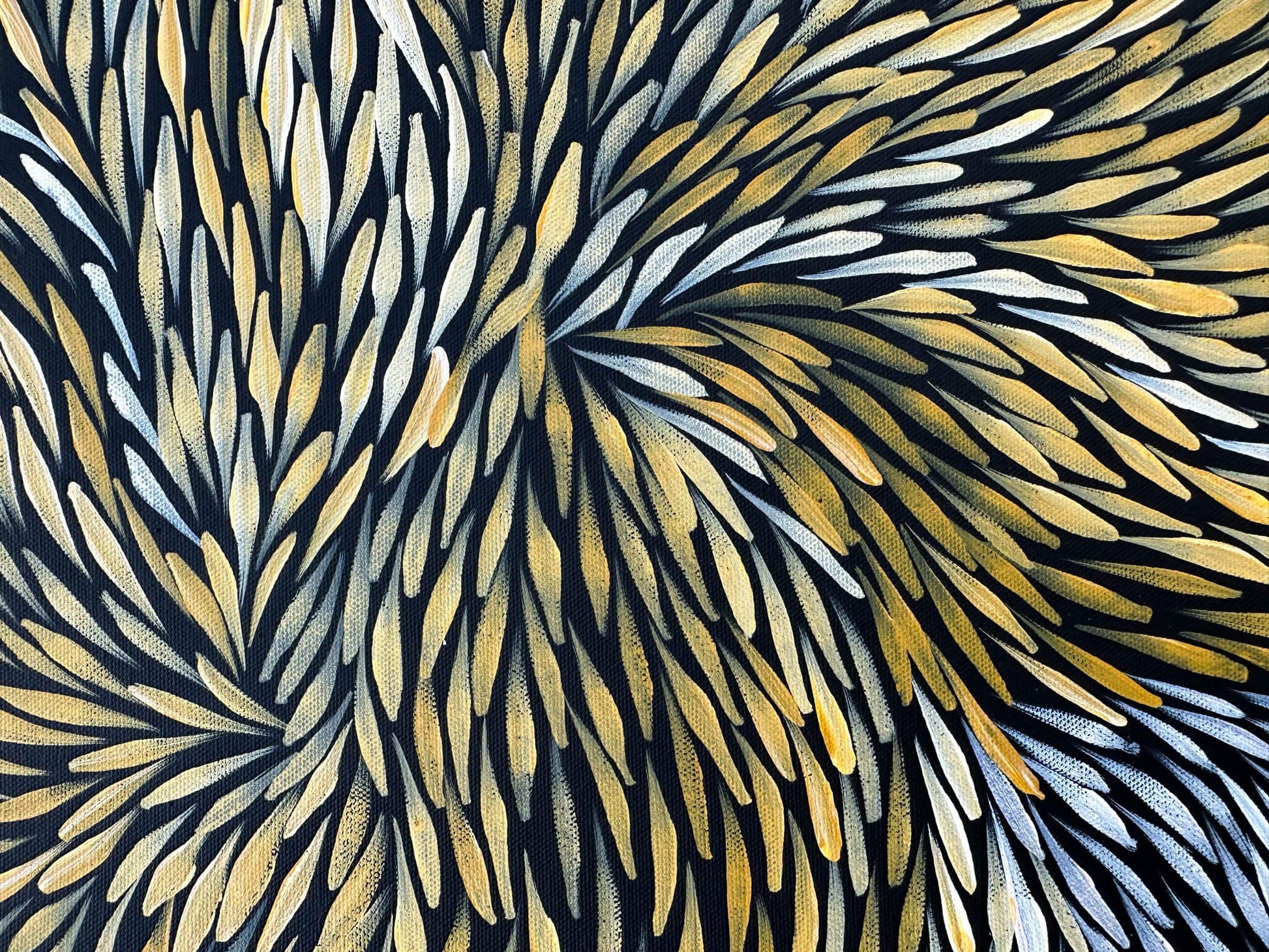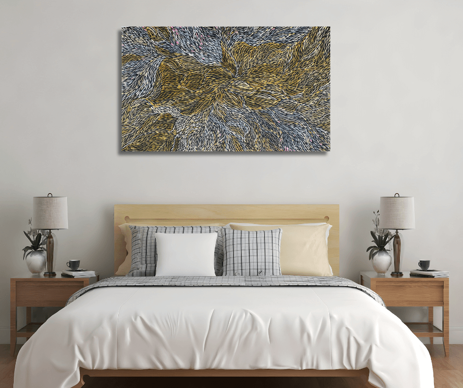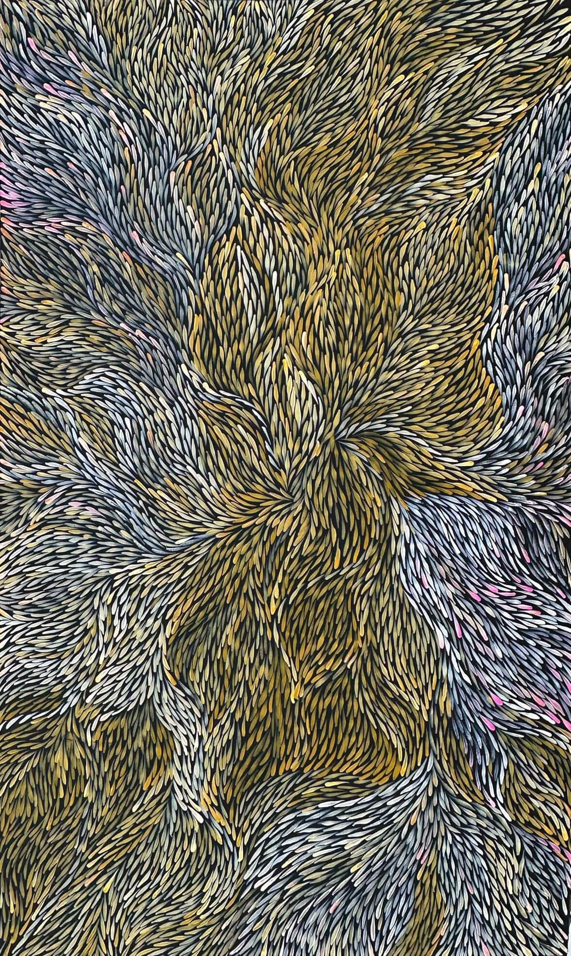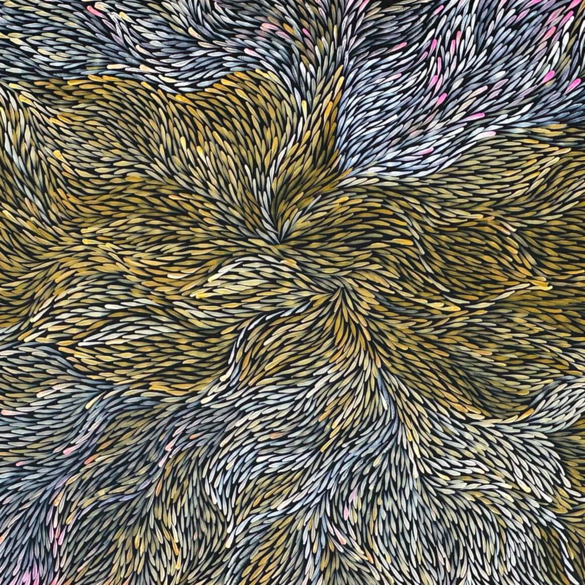 She is well known for her great sense of movement and colour depicting the leaves and seeds changing colours throughout the seasons. Various leaves and seeds are predominately collected by the women for medicine and food from a variety of trees/shrubs for use all year round. The leaves and seeds were once vital to Jeannie and her ancestors and through her paintings these stories are passed down and celebrated.