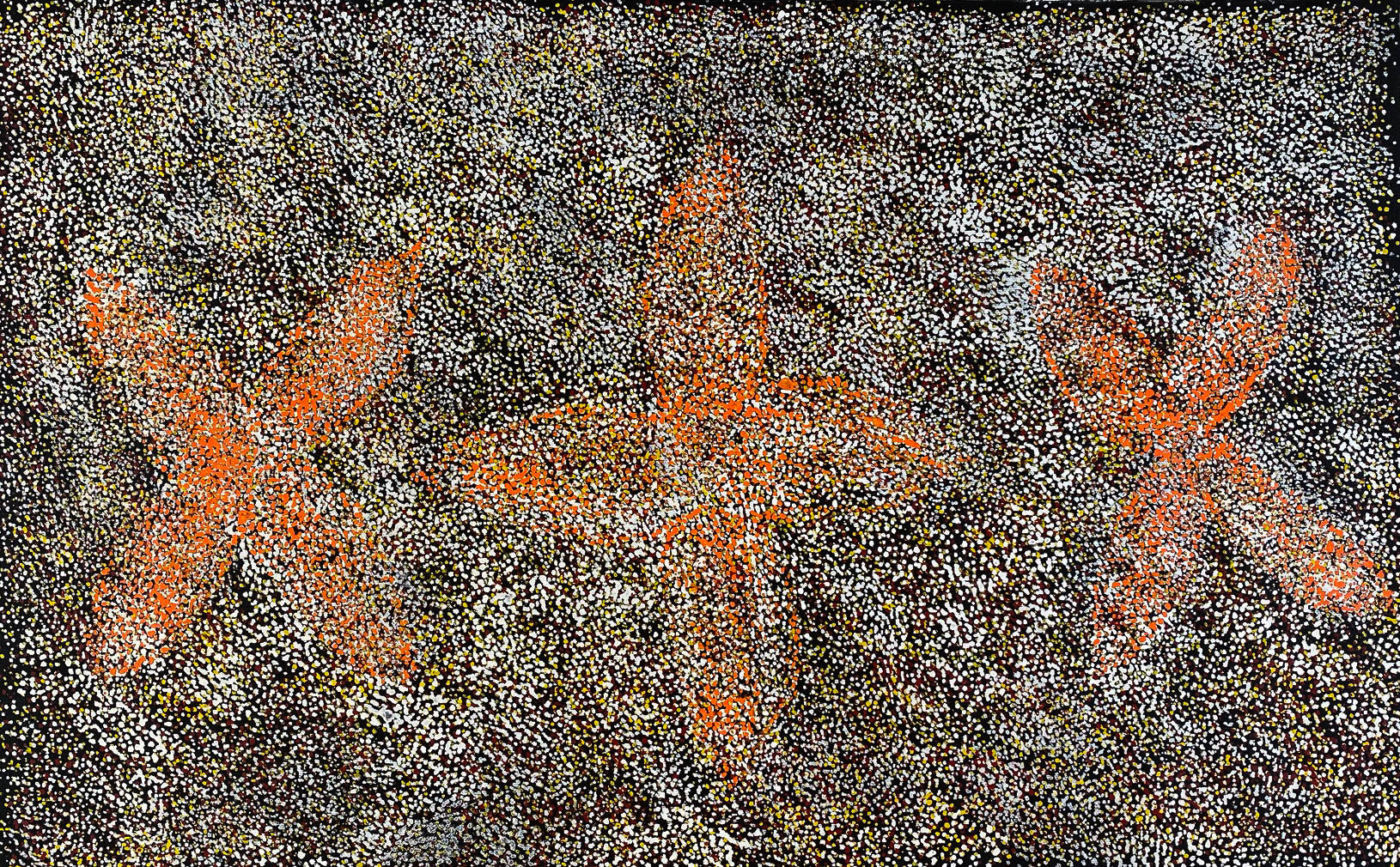 She is well known for her great sense of movement and colour depicting the leaves and seeds changing colours throughout the seasons. Various leaves and seeds are predominately collected by the women for medicine and food from a variety of trees/shrubs for use all year round. The leaves and seeds were once vital to Jeannie and her ancestors and through her paintings these stories are passed down and celebrated.