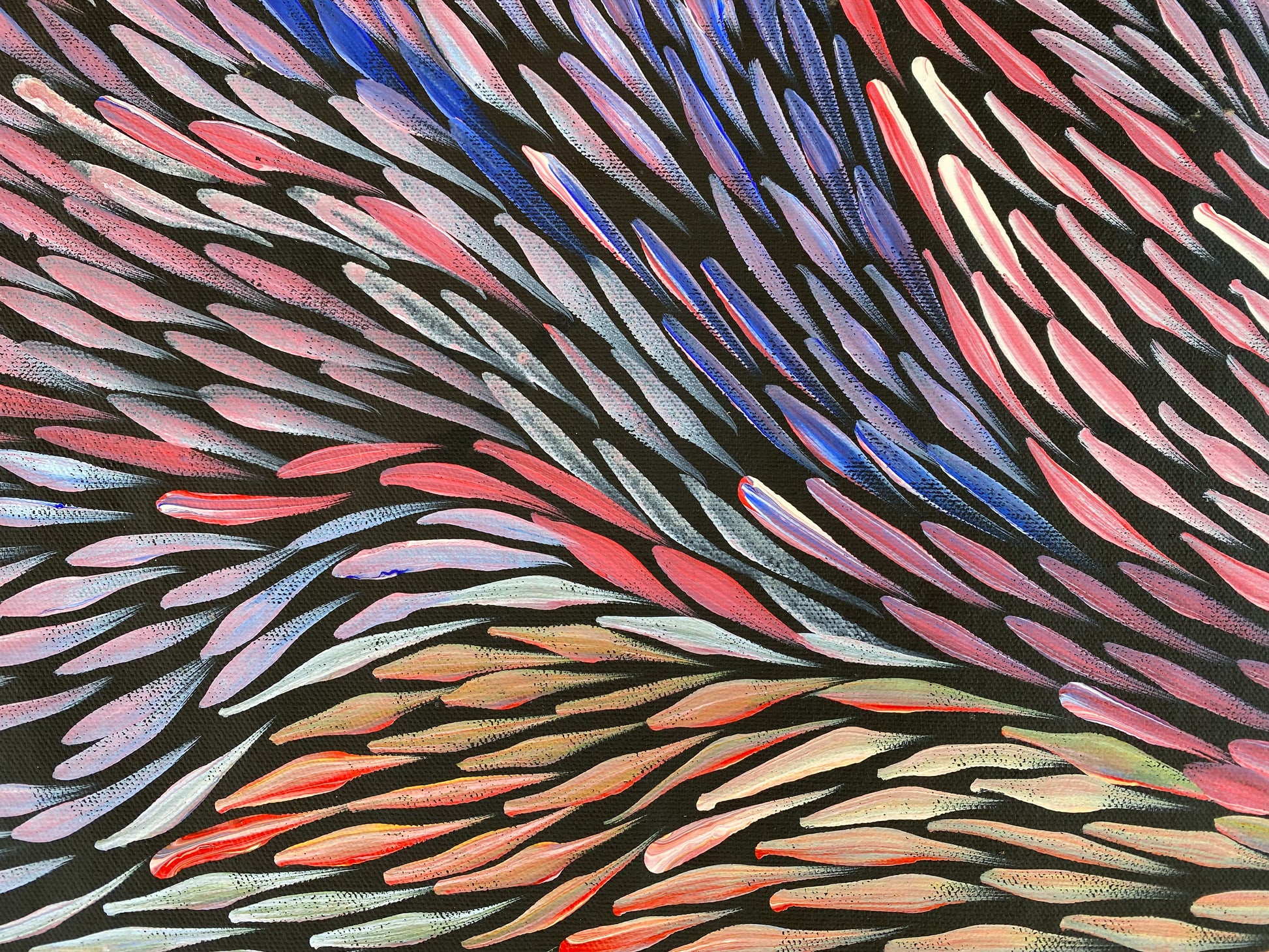 She is well known for her great sense of movement and colour depicting the leaves and seeds changing colours throughout the seasons. Various leaves and seeds are predominately collected by the women for medicine and food from a variety of trees/shrubs for use all year round. The leaves and seeds were once vital to Jeannie and her ancestors and through her paintings these stories are passed down and celebrated.