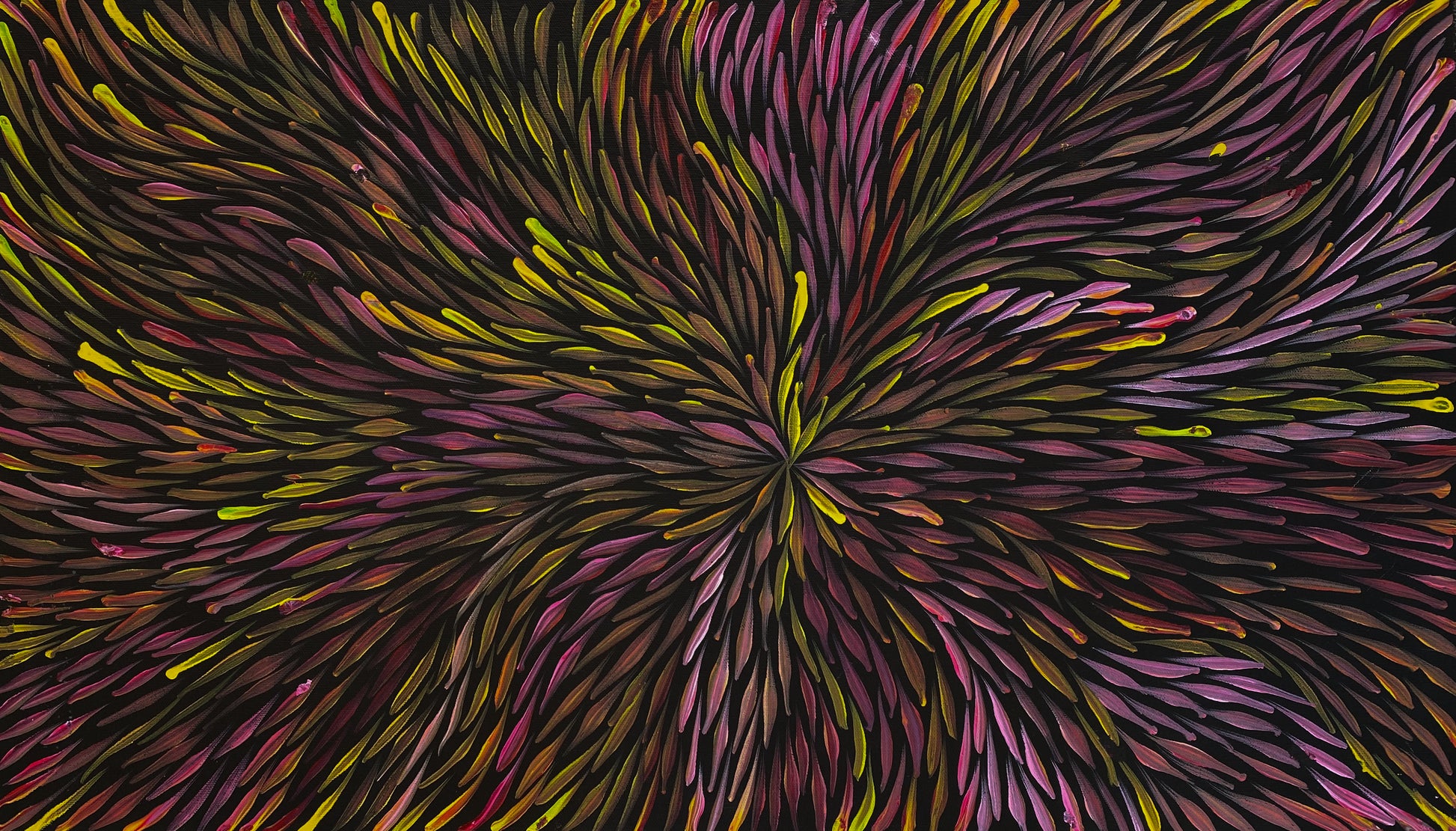 She is well known for her great sense of movement and colour depicting the leaves and seeds changing colours throughout the seasons. Various leaves and seeds are predominately collected by the women for medicine and food from a variety of trees/shrubs for use all year round. The leaves and seeds were once vital to Jeannie and her ancestors and through her paintings these stories are passed down and celebrated.