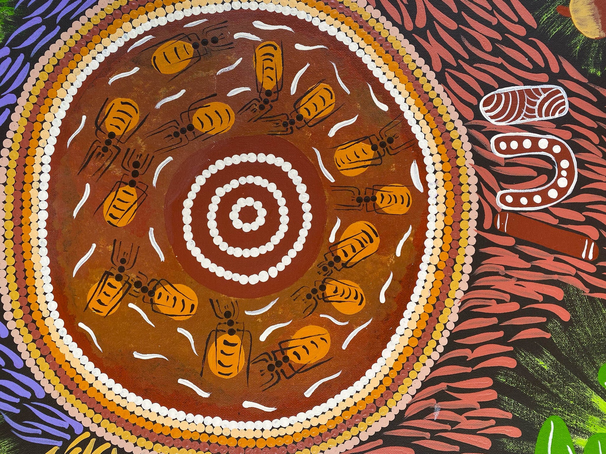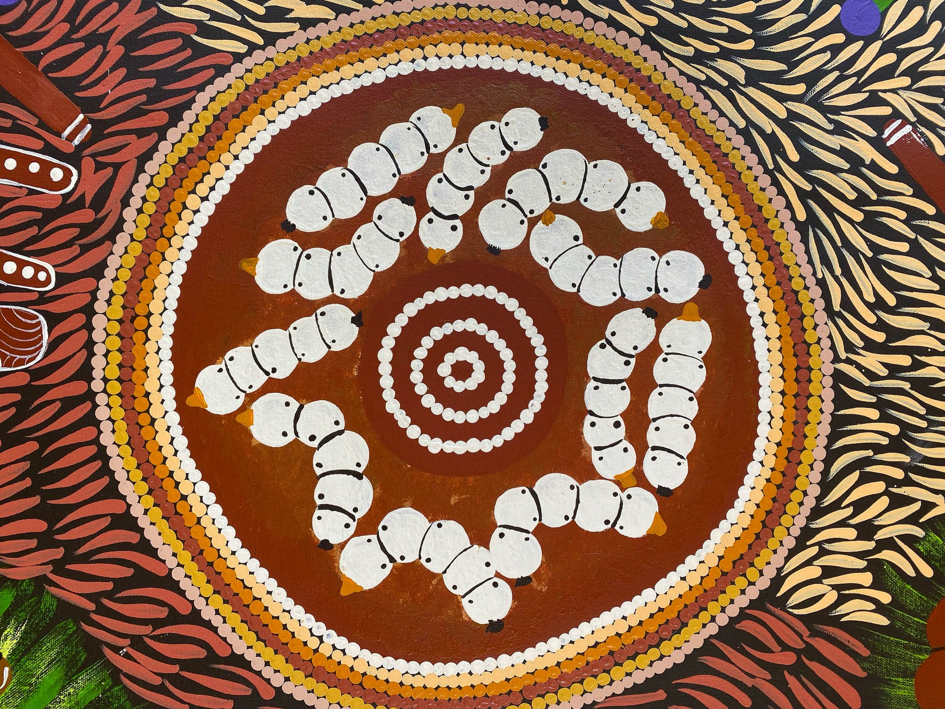 This artwork is called Bush Tucker which depicts various seeds, berries, honey ant, witchetty grubs, bush tomato and bush banana which the women collect from their country.