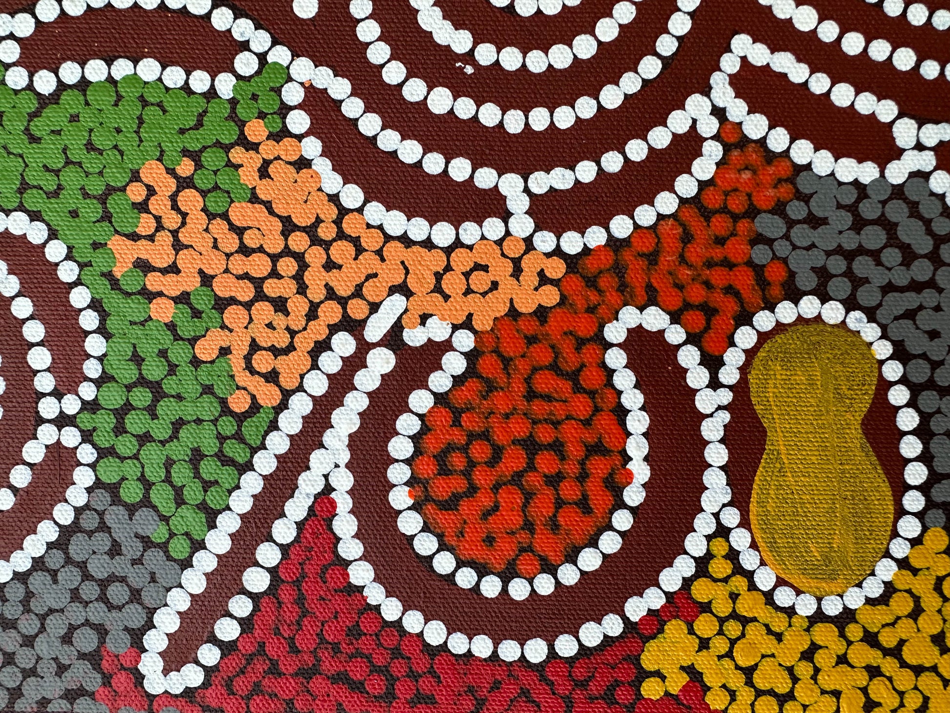 Lynette employs the traditional Warlpiri technique of dot painting, utilising iconography and earthy hues to narrate her stories. In this style, she skillfully incorporates concentric circles to represent various elements, such as rock holes and Termite mounds (Mingkirri). The oblong shape around the concentric circles are the Pampardu (Flying Ant/Termite).