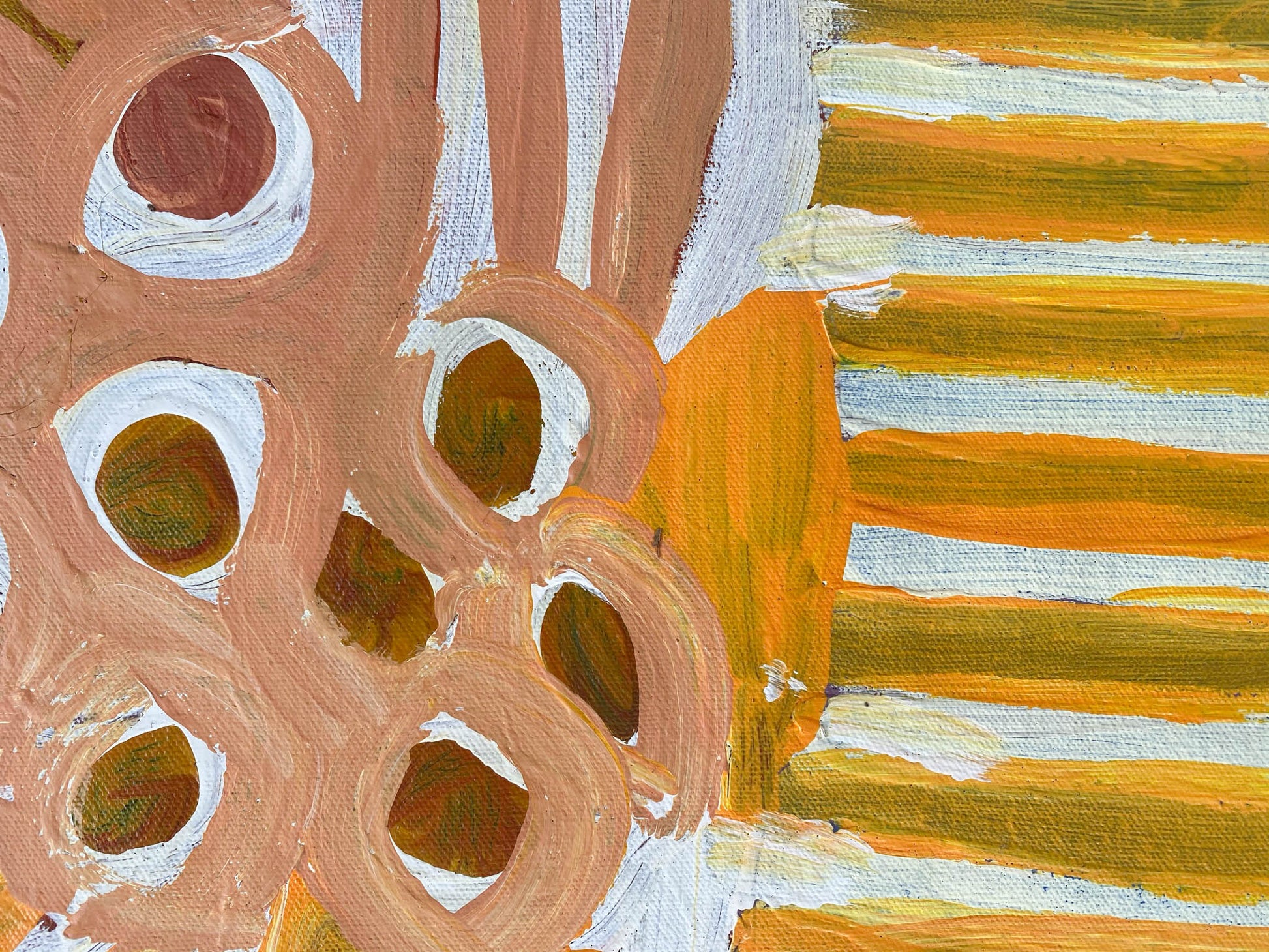 Towards the end of her painting career Makinti’s eyesight was failing but it did not dampen her passion for painting. She would visit our family home (or fondly called 'the farm') and ask for vibrant acrylic paints so she could take home and later come back with her vibrant, colourful canvas.