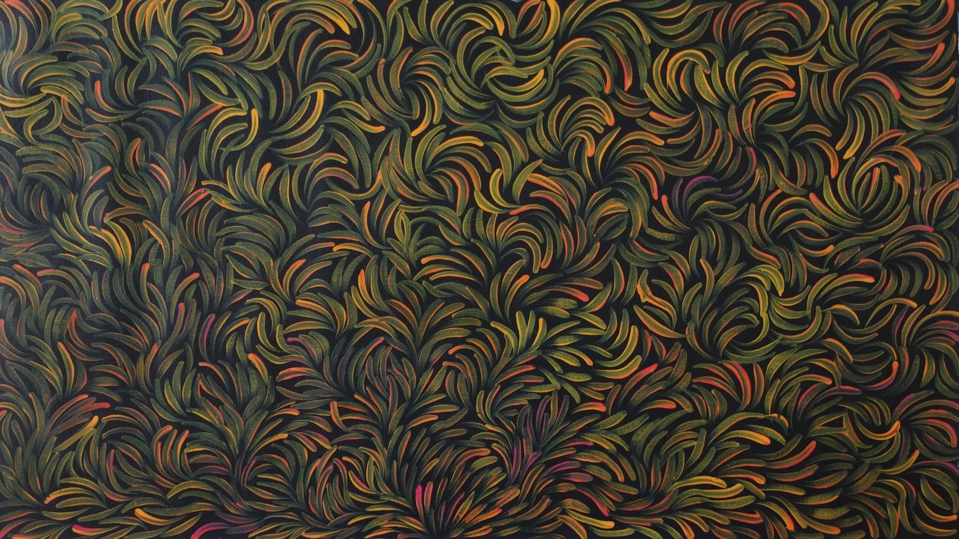 Her cousin Gloria Petyarre, a renowned artist, began instructing Margaret to paint at an early age when she wasn’t attending school in Alice Springs. Over the years Margaret has developed her own unique style as can be seen with her medicine leaves and spinifex grass where her flowing lines depict the plants blowing in the wind.  The women collect the leaves of a particular plant and is prepared to be used on wounds and sores and other medicinal leaves are boiled and consumed for coughs and colds. Her work is sought after by  for their great sense of movement and array of beautiful use of colour.