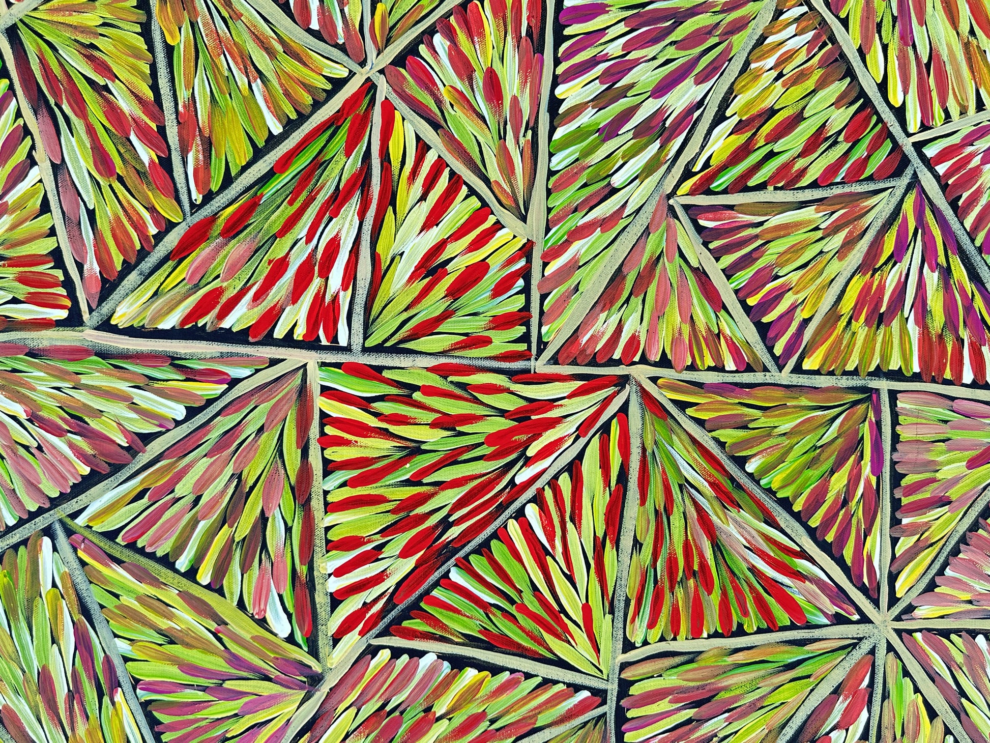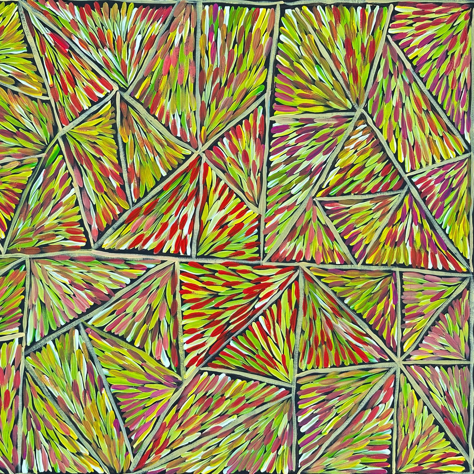 Traditionally in Aboriginal Culture, when a person is deceased they not use the person’s name and all photos (any digital images) are not to be used. Out of respect we do not have any images of Margaret however we have used her name as it would be very difficult to list the painting with no name attached.
