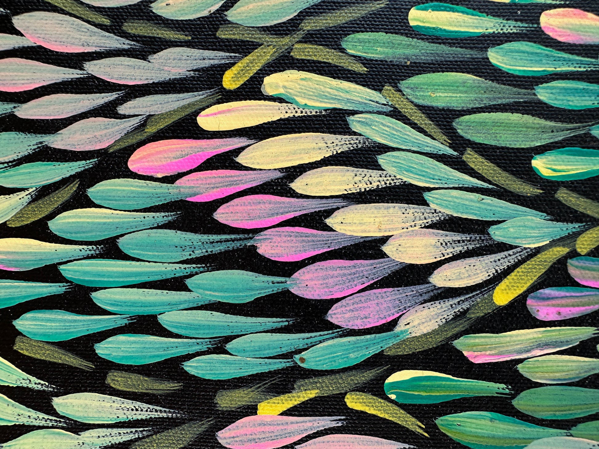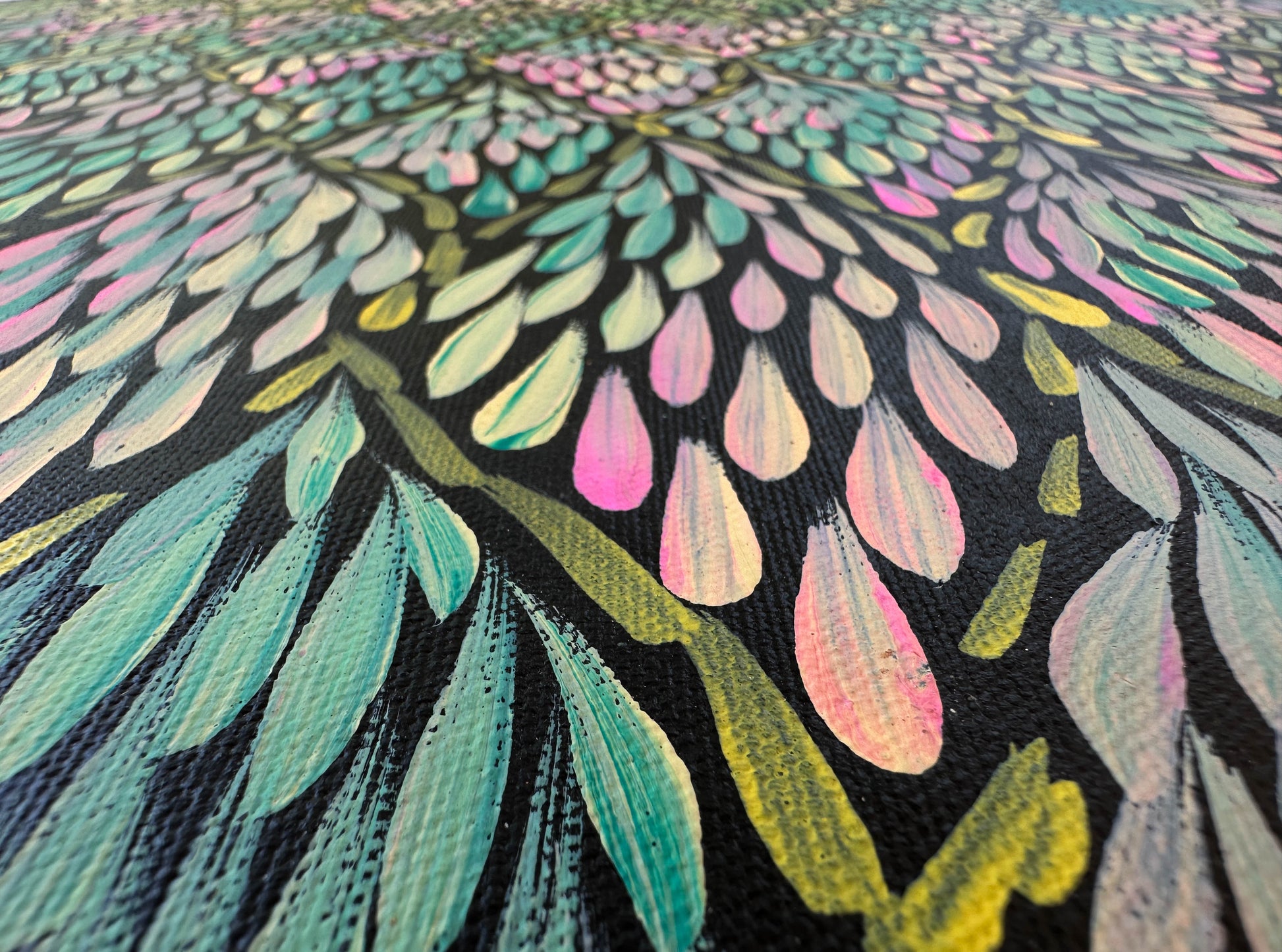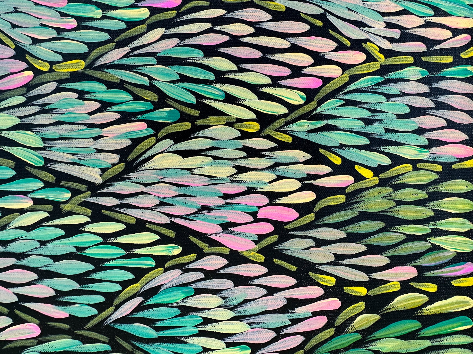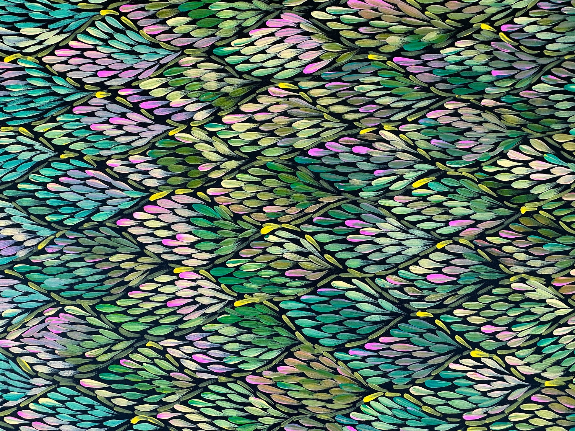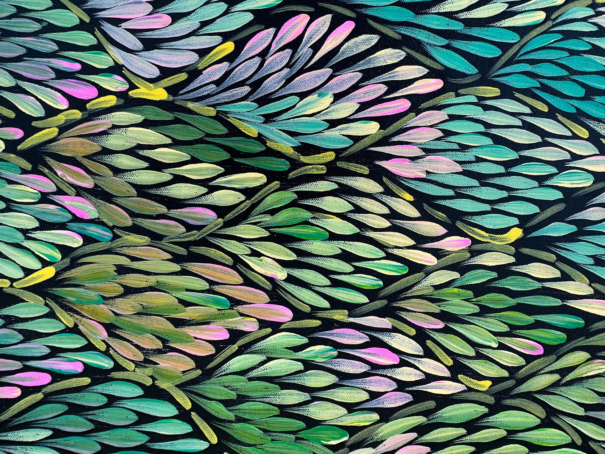 Margaret painted various dreaming's including Bush Medicine. The leaves of these valuable plants (there are many species) were used to treat a range of ailments and were prepared in various ways including, boiling the leaves and the liquid consumed. The leaves were made into a poultice and placed onto the body. Leaves were also burned and the smoke was allowed to be inhaled to treat respiratory illnesses and also to ward off bad spirits.