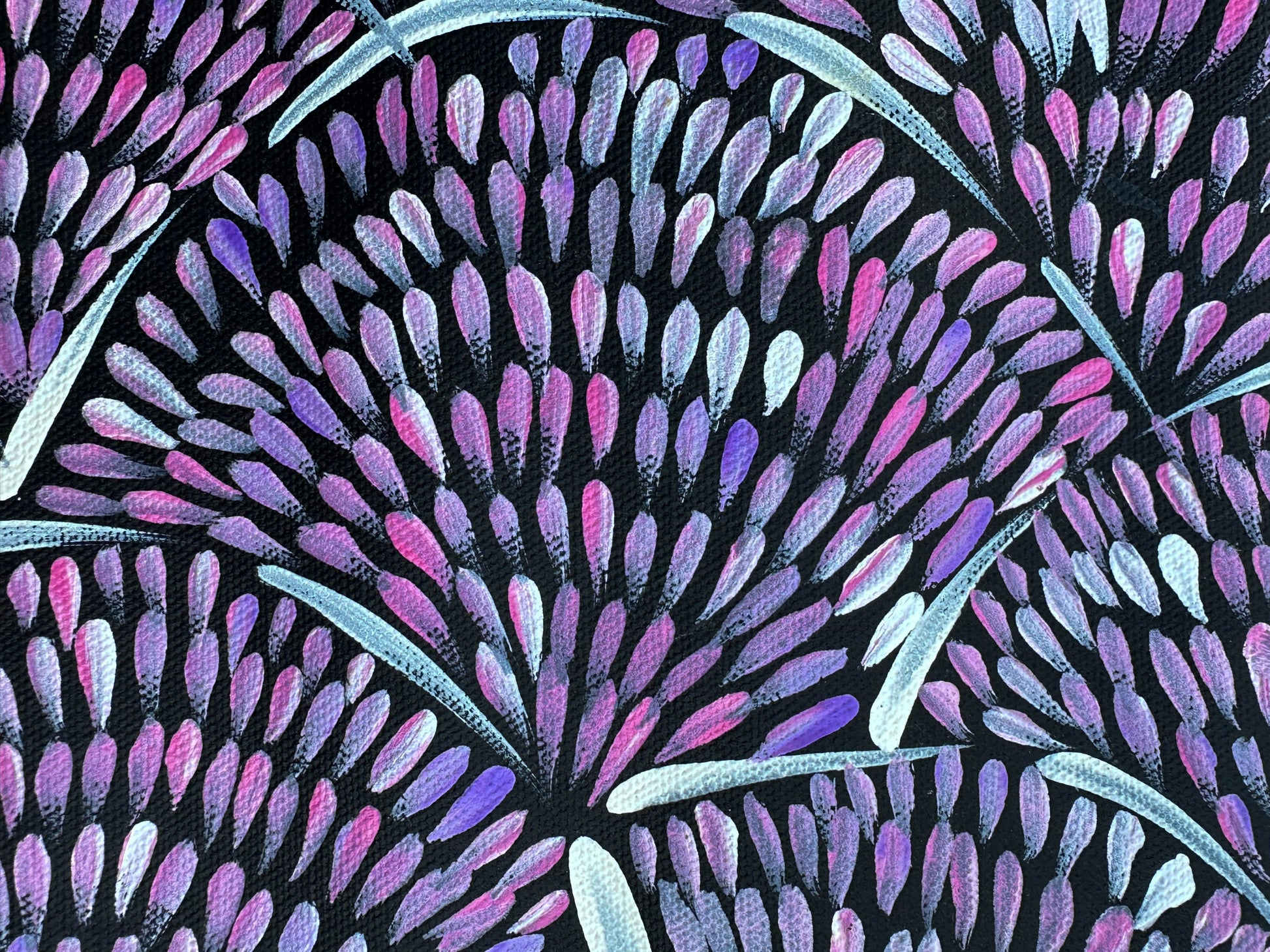 Traditionally in Aboriginal Culture, when a person is deceased they not use the person’s name and all photos (any digital images) are not to be used. Out of respect we do not have any images of Margaret however we have used her name as it would be very difficult to list the painting with no name attached.