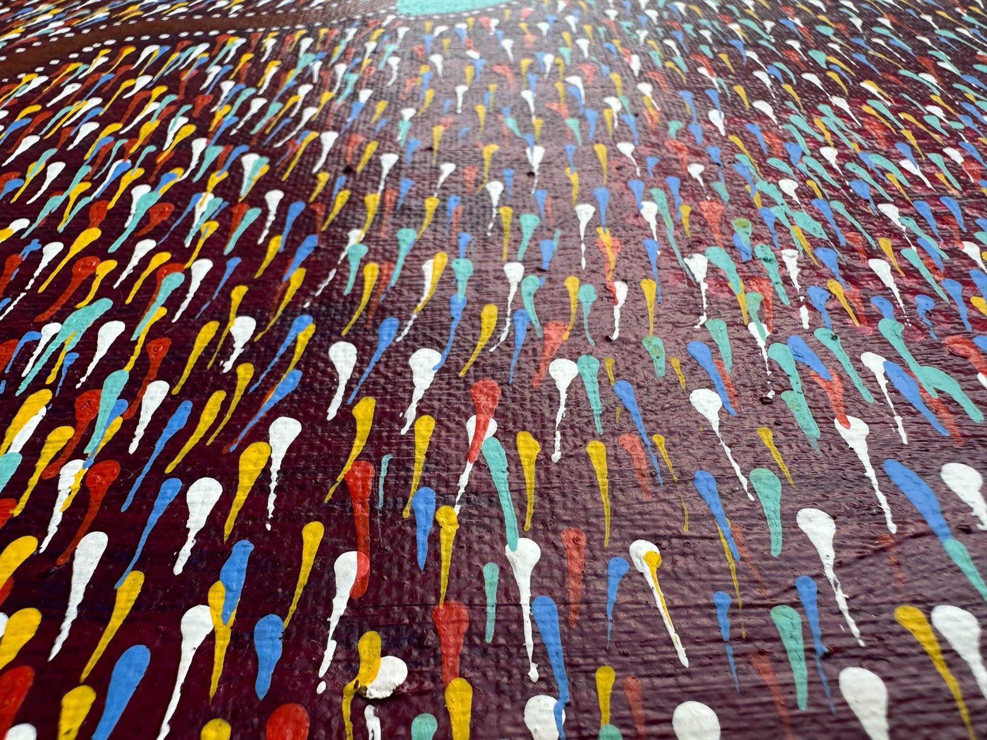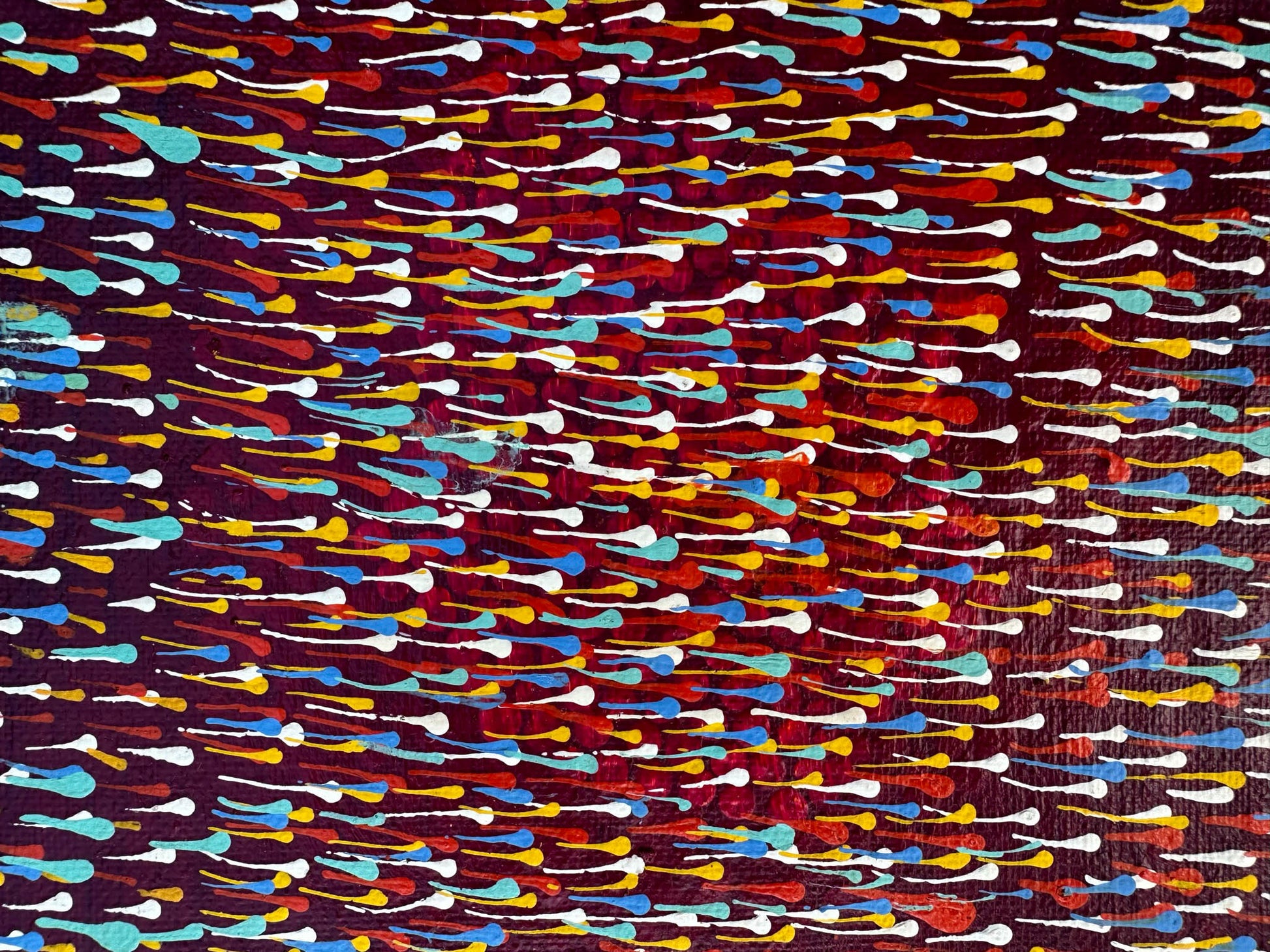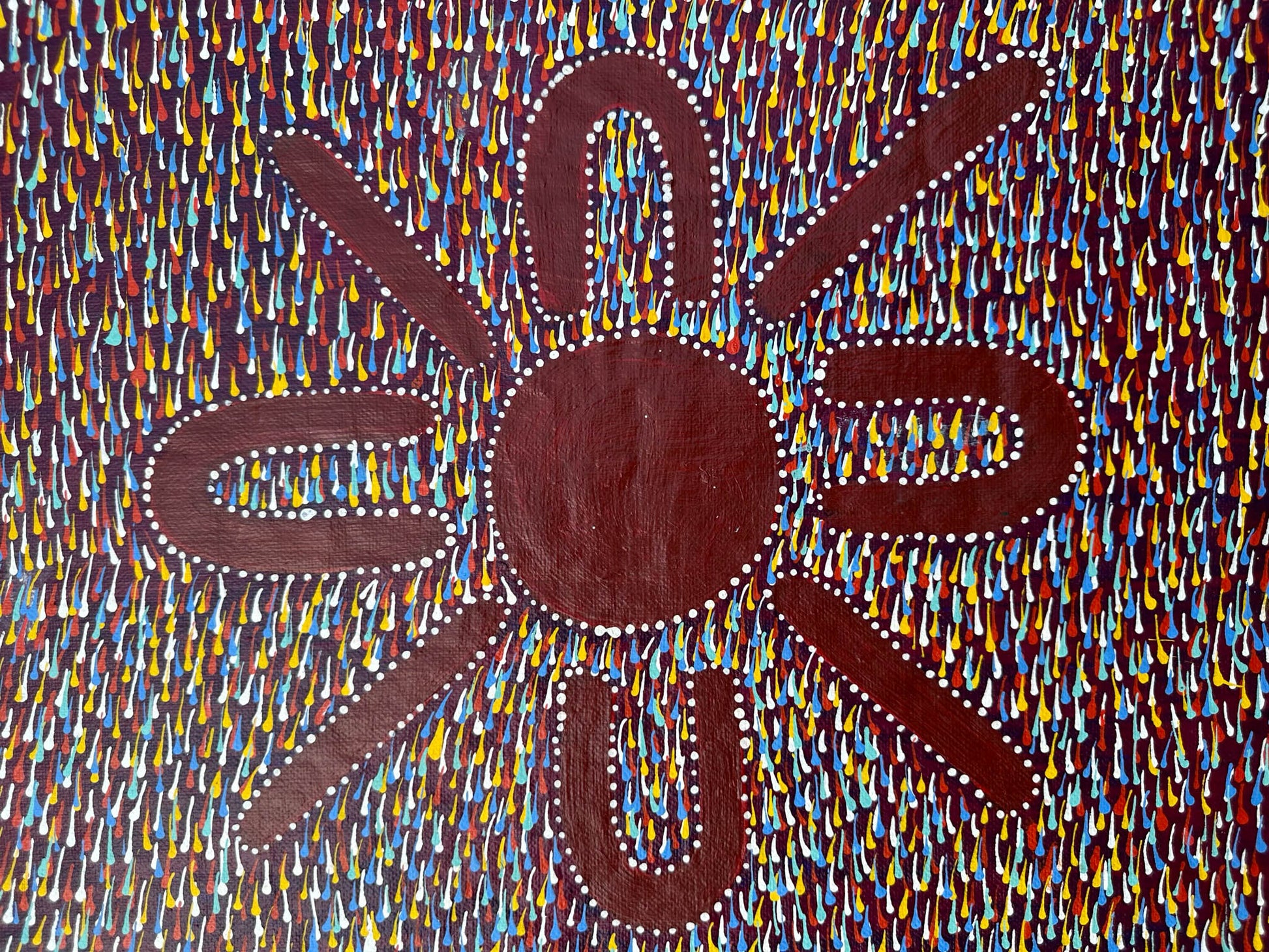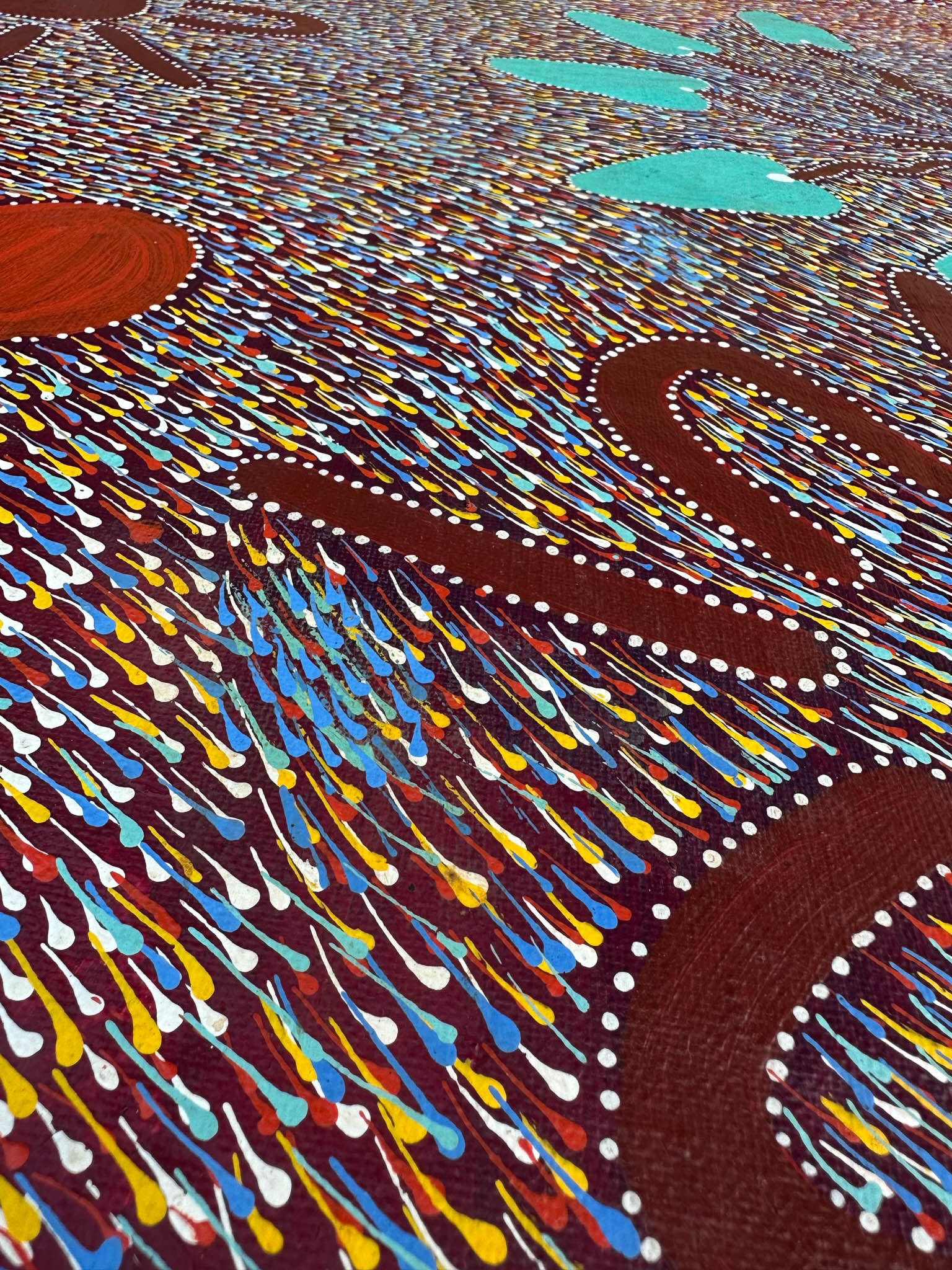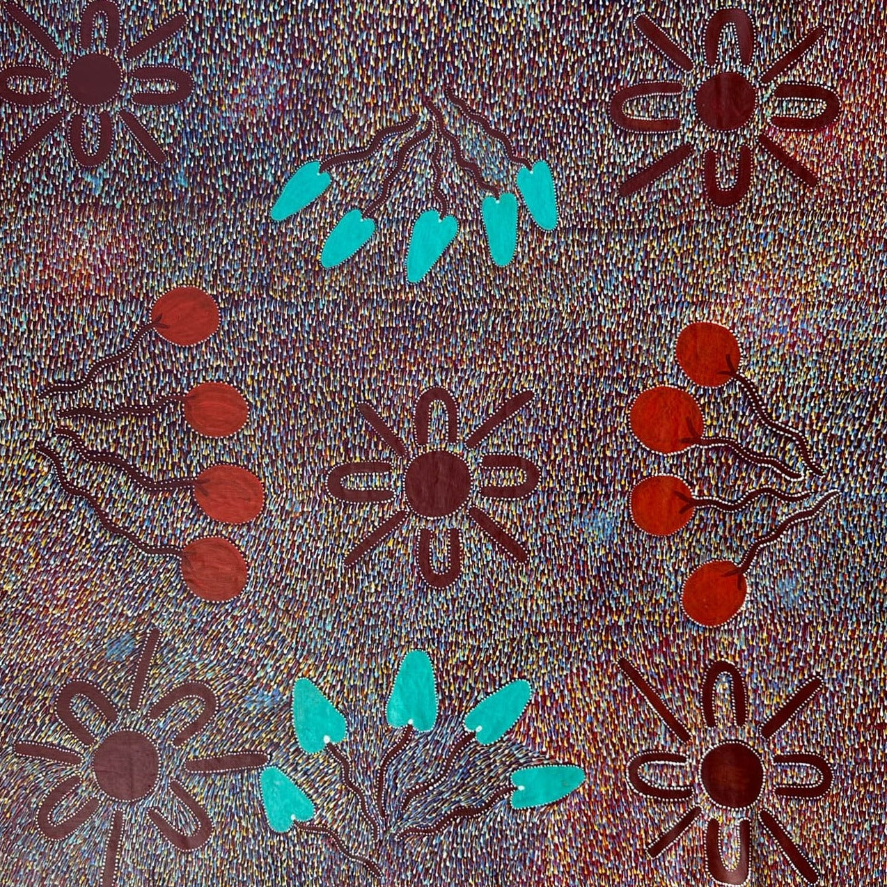 In this painting, Marlene captures the essence of the bush banana with aqua hues, alongside the rich crimson portrayal of the bush tomato. Depicted in each of the four corners, women gather, seen as a U-shape, with their digging sticks alongside them—a poignant representation of their collective gathering.