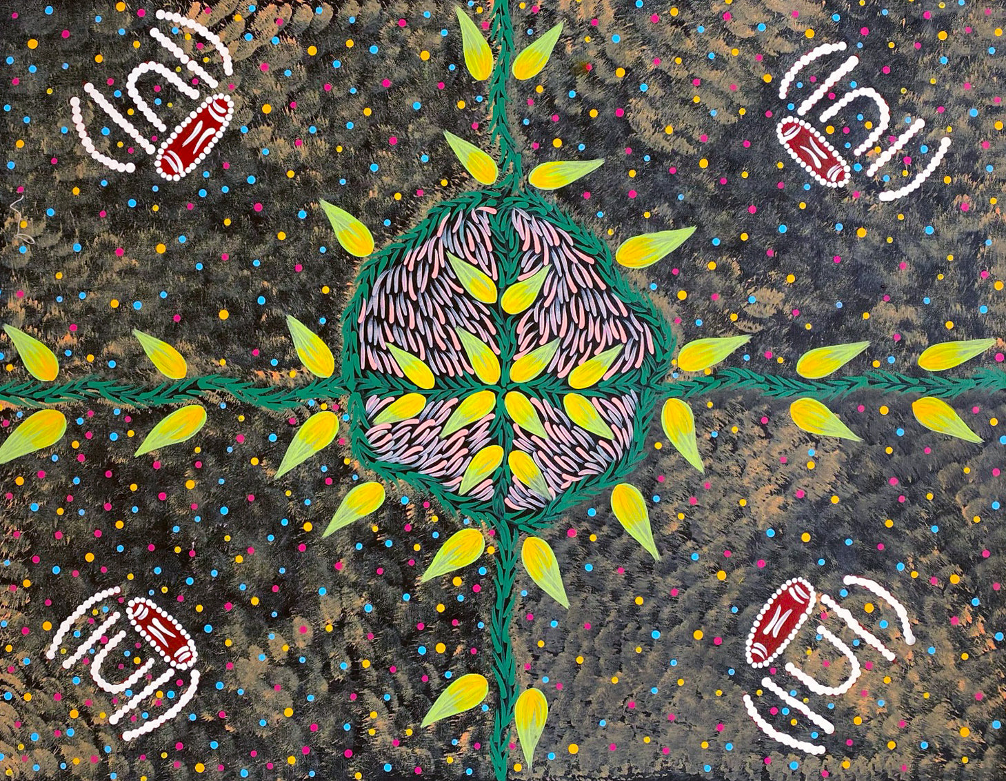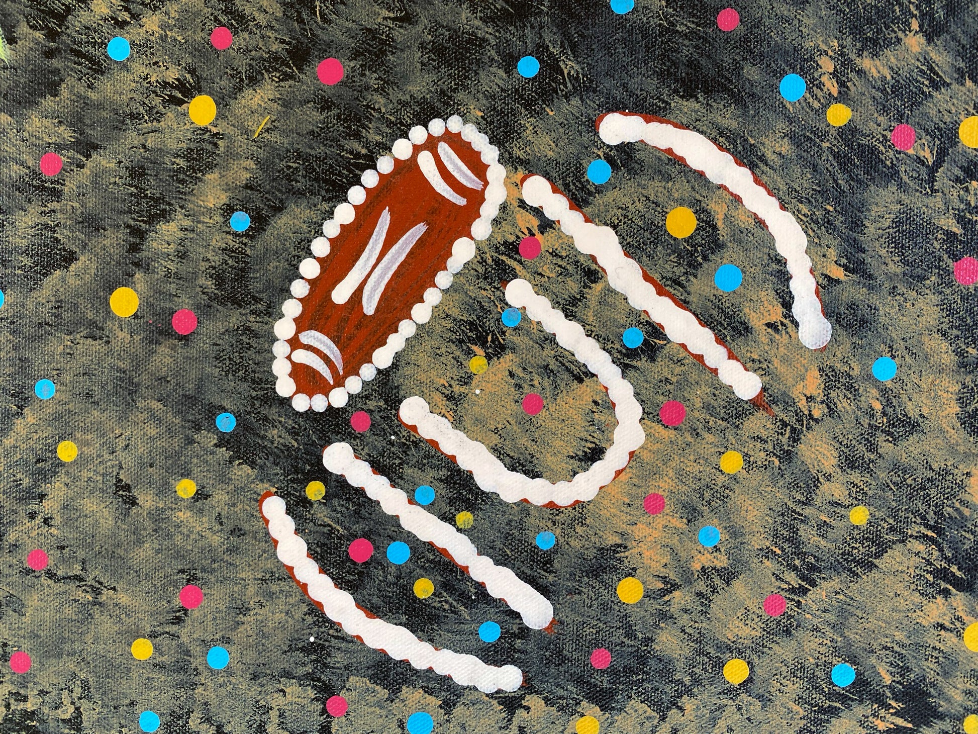 Her style is unique.  Mary has mastered a blend of traditional and contemporary styles, incorporating iconography to depict her dreaming's.