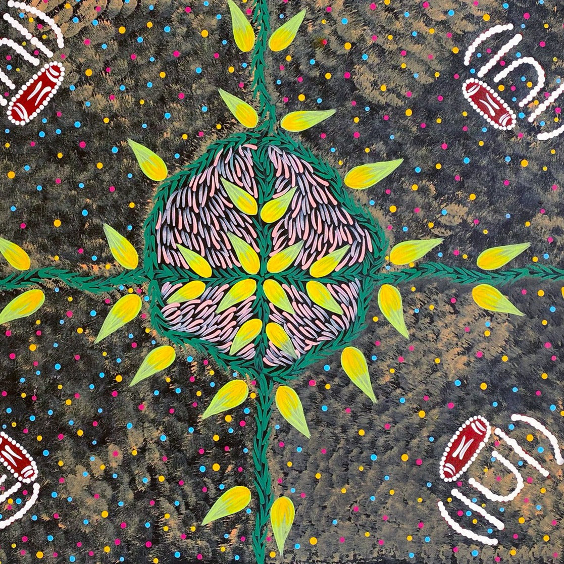 Her art tells the stories related to her Country and beautiful depictions of the bush tucker collected by the women of her community.