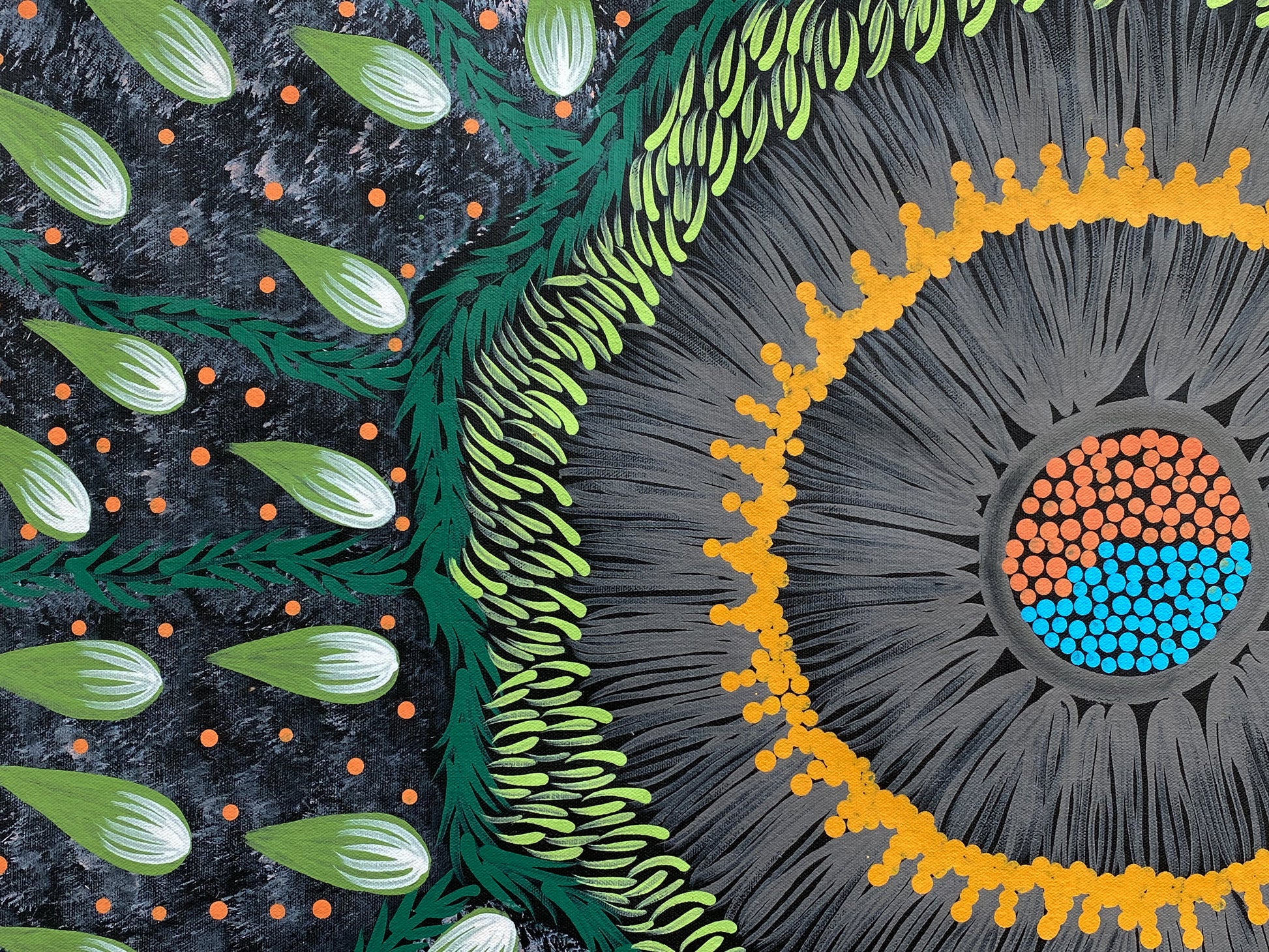 Her art tells the stories related to her Country and beautiful depictions of the bush tucker collected by the women of her community.