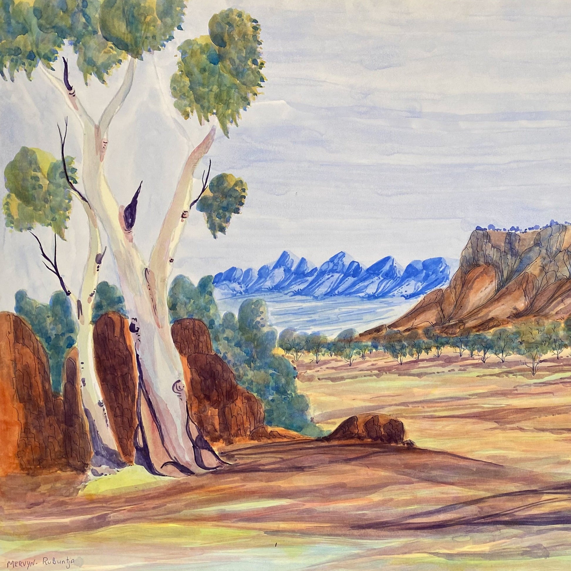 Mervyn’s family moved to Hermannsburg when he was in his early teenage years, it was here his father taught him how to paint in the water colour style. He was fortunate to watch other prominent water colour artists in Hermannsburg.