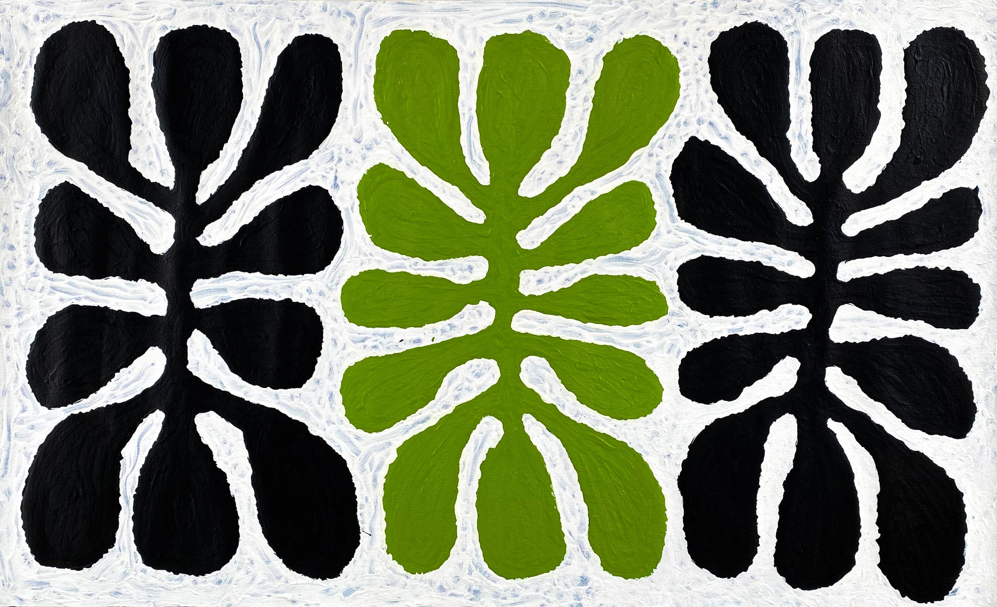 She commenced painting in the early nineties in the same style of the Papunya Tula Artists. Later, creating her iconic bold designs of the Watiya Tjuta trees and the sandhills of her father’s country, Uwalki (near Kintore). The trees provide wood for making spear shafts and other objects for ceremonies.