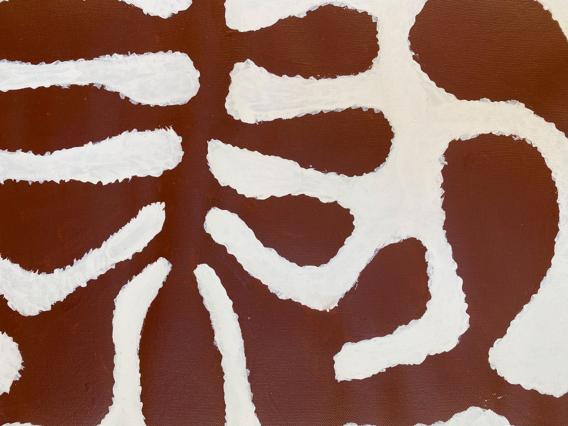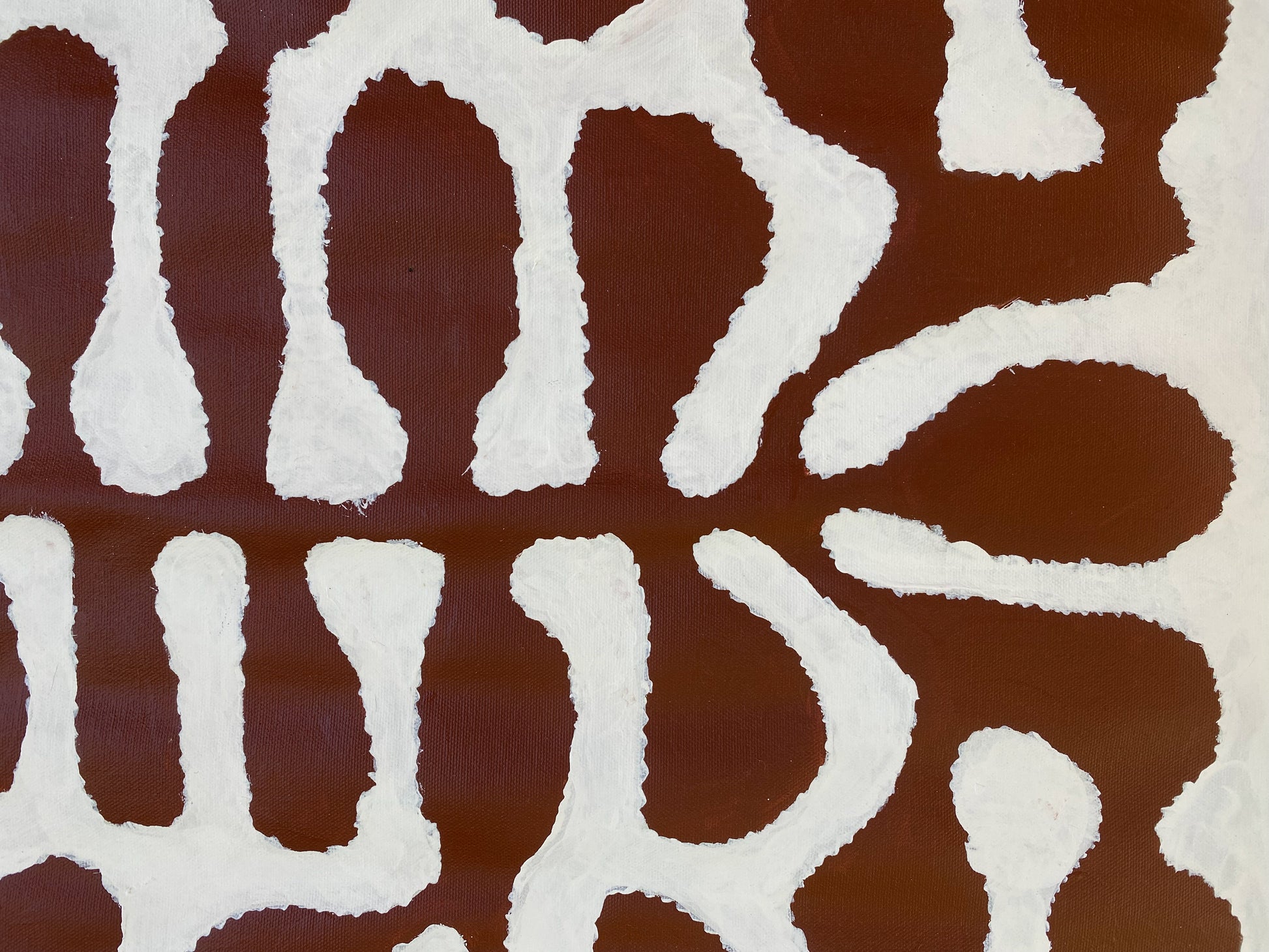 She commenced painting in the early nineties in the same style of the Papunya Tula Artists. Later, creating her iconic bold designs of the Watiya Tjuta trees and the sandhills of her father’s country, Uwalki (near Kintore). The trees provide wood for making spear shafts and other objects for ceremonies.