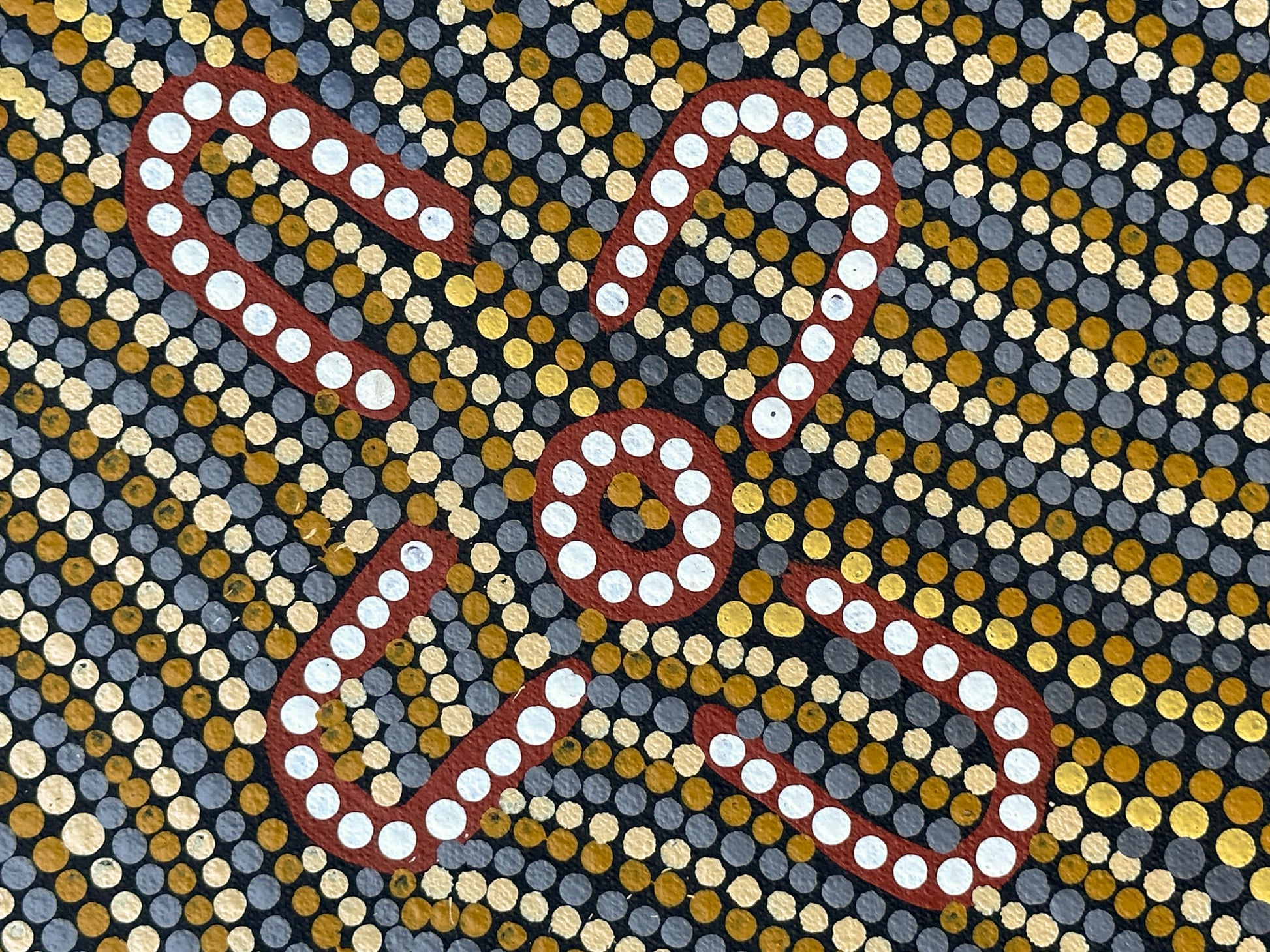 Nancy paints in the traditional dot style using iconography to depict her dreaming’s.