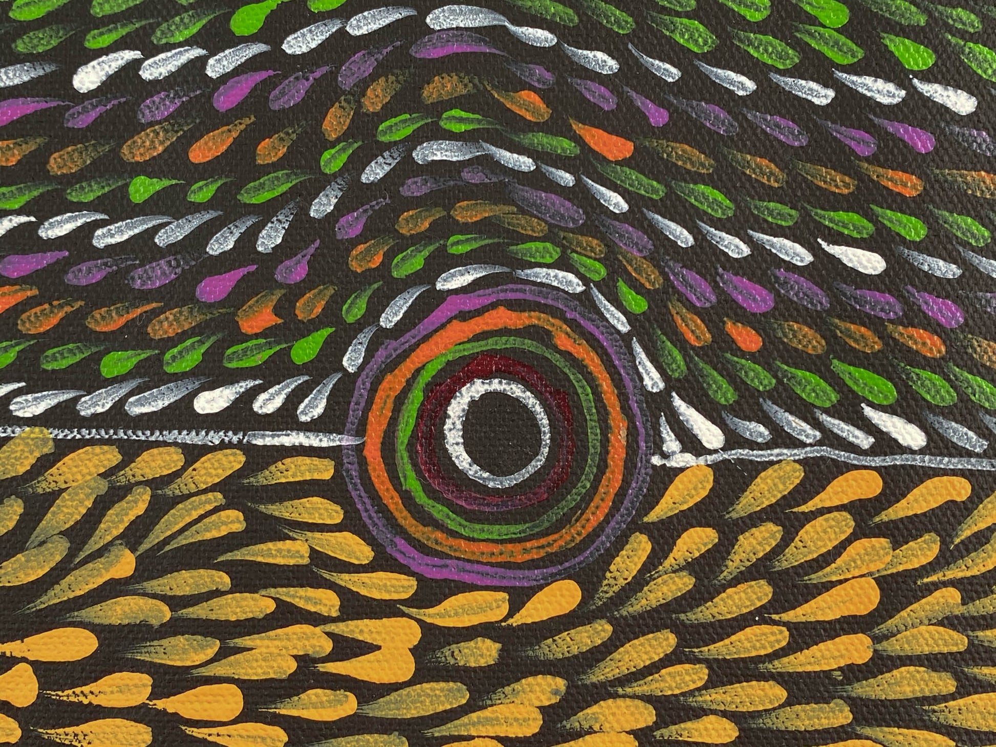 Rayleen is a Utopian artist and predominately paints the Dreaming passed down her of Bush Medicine. These are seeds found in the hills of her country and given to people who are sick and to young children for immunity.